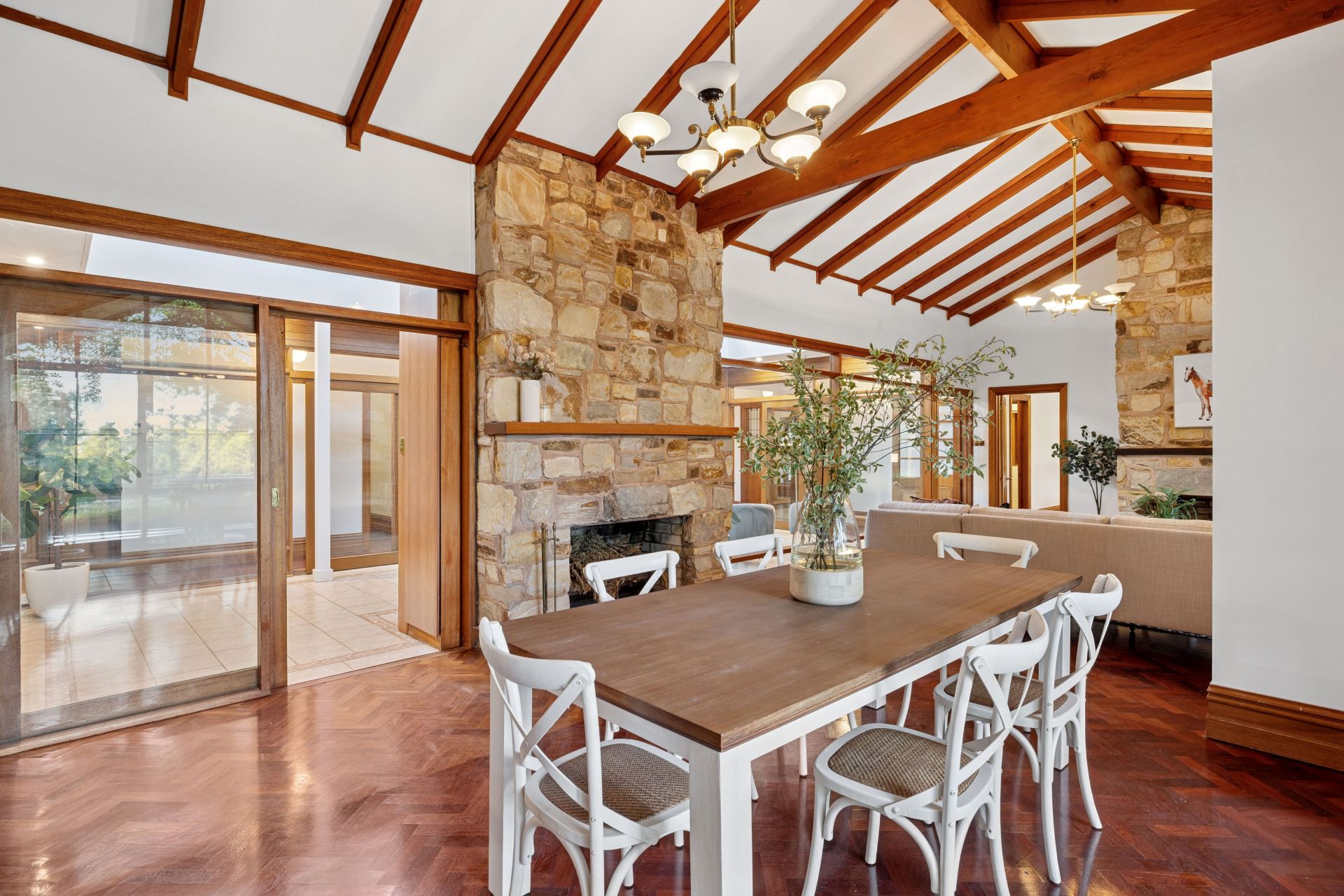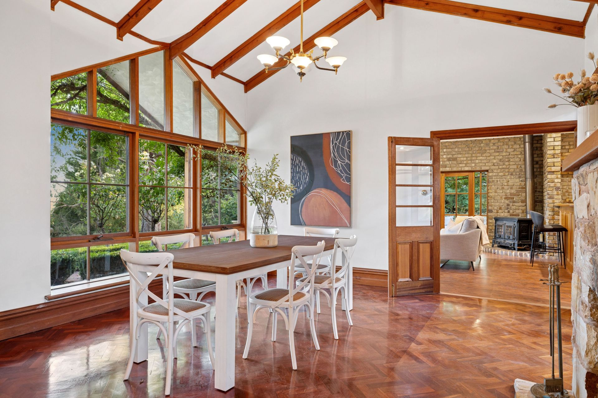 Inside, soaring raked ceilings, exposed beams, feature stone, brickwork, leadlight and parquetry floors reflect a level of craftsmanship seldom seen – every considered detail emphasizing the four-bedroom home's charm, cohesion and flow across some 391sqm of indoor/outdoor living.