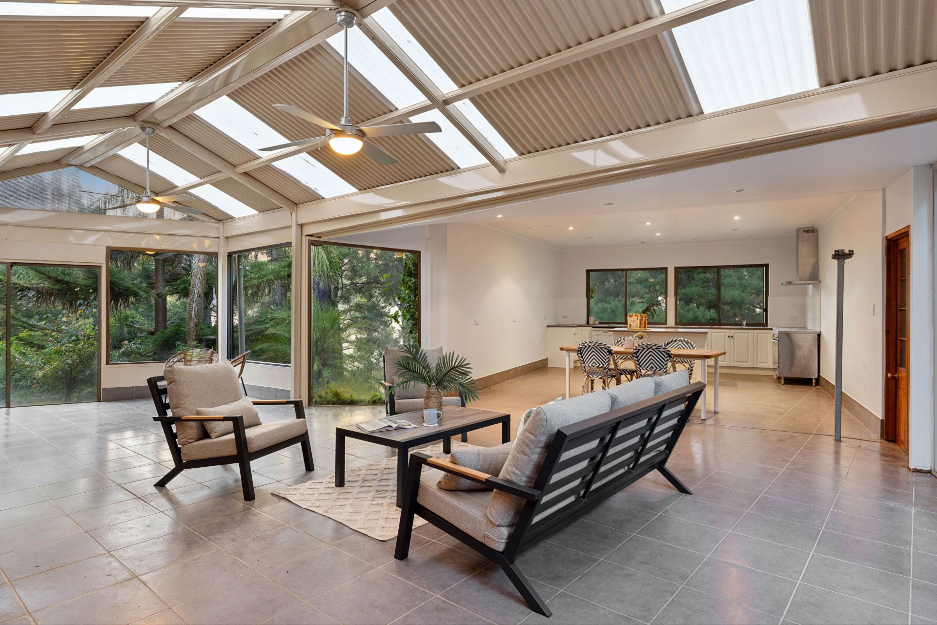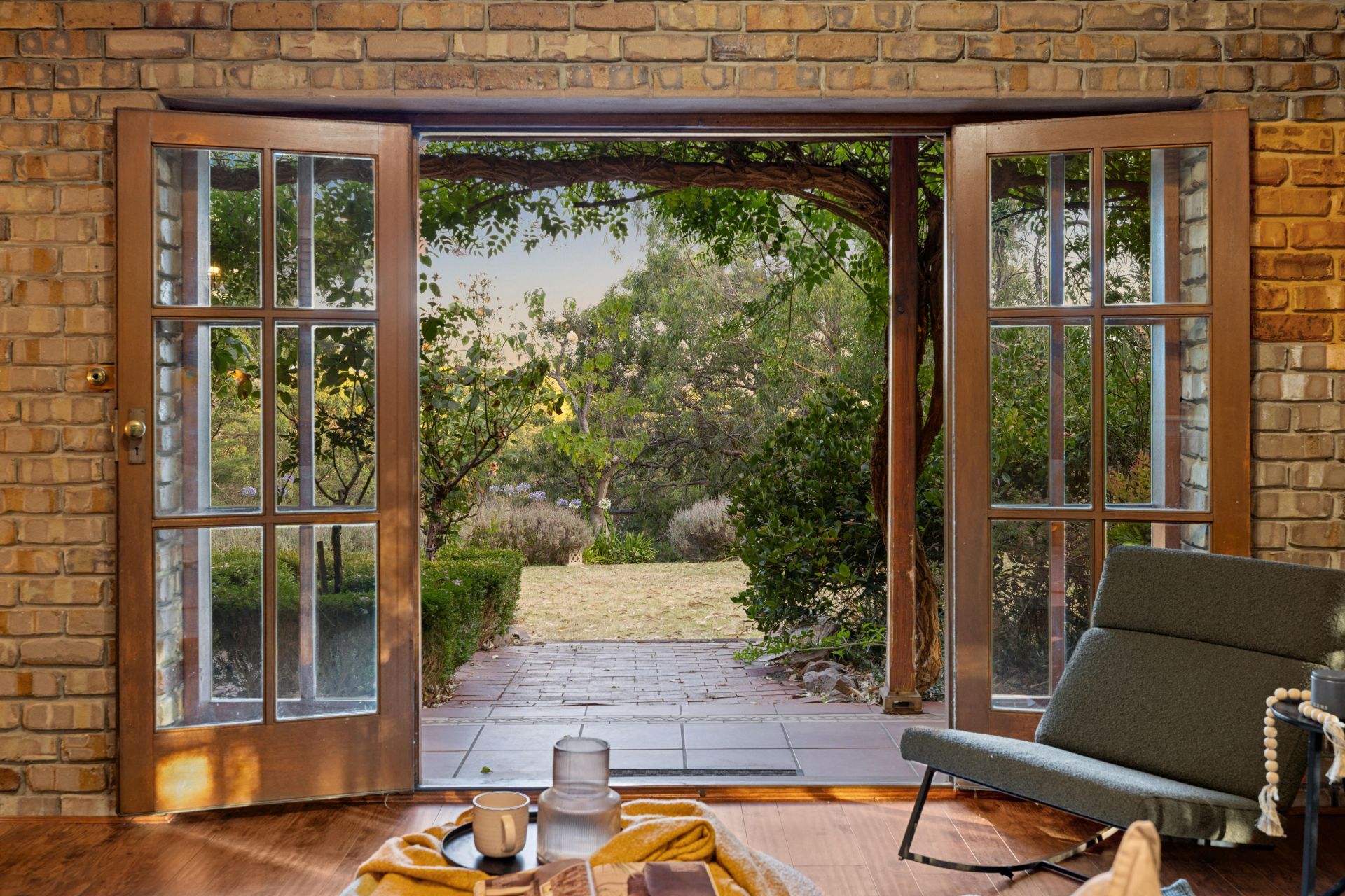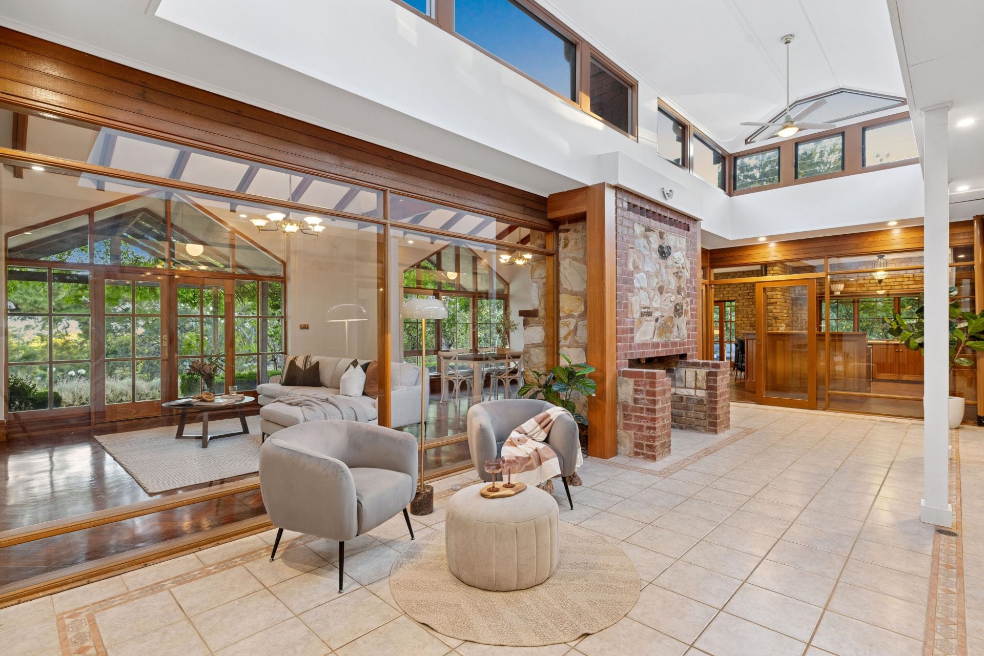 Anchored by a central conservatory-turn-living zone, natural light and treetop views radiate through high-set internal panes, creating the most striking corridor contradiction – and an ambient third living space.