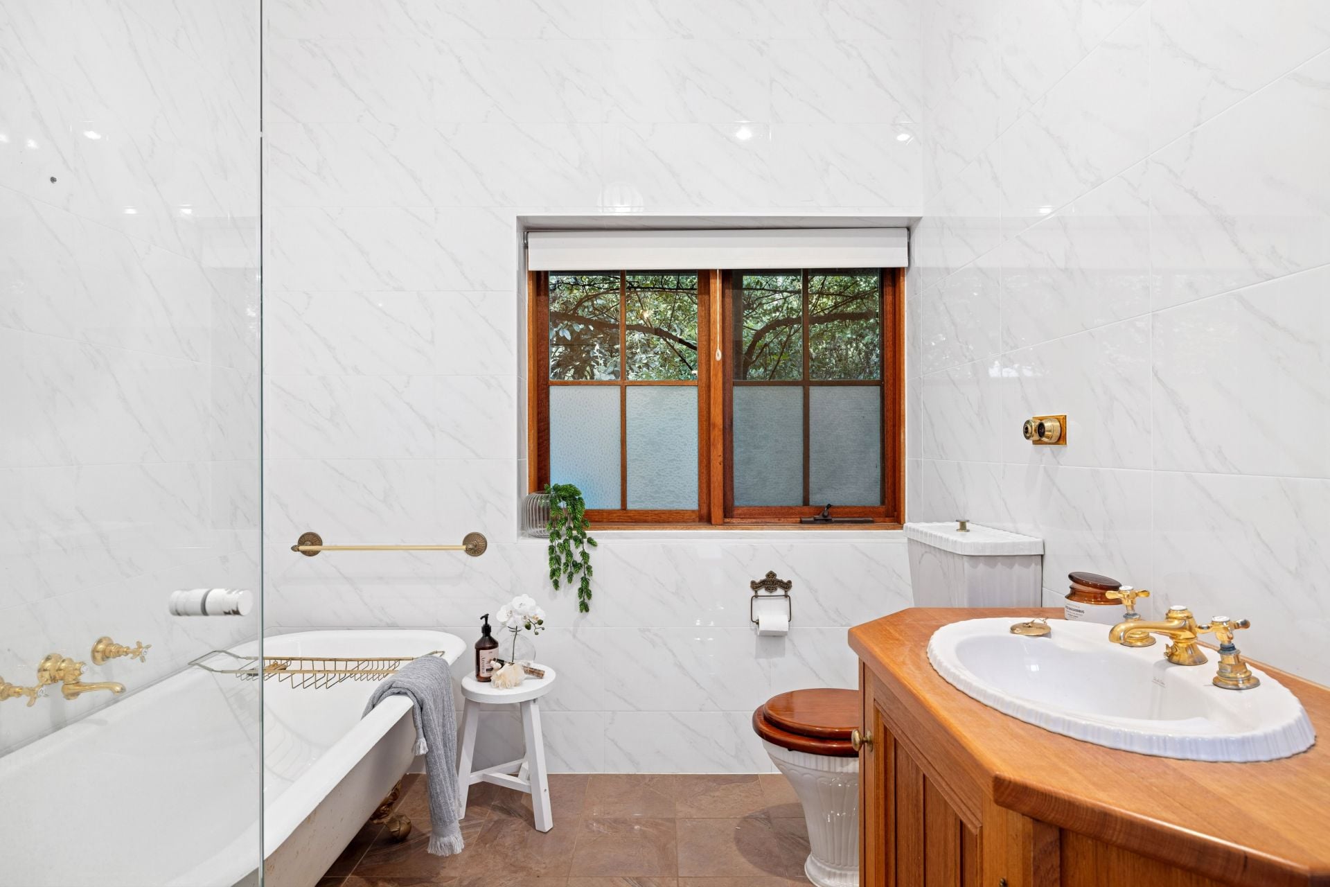 Bedrooms one and two benefit from dual-aspect windows filling each with light and lush garden views, while the cornering family room floats outside via French doors. The guest bathroom, with brass tapware, timber joinery, and a roll-top bath, reinforces the home's classic country theme.