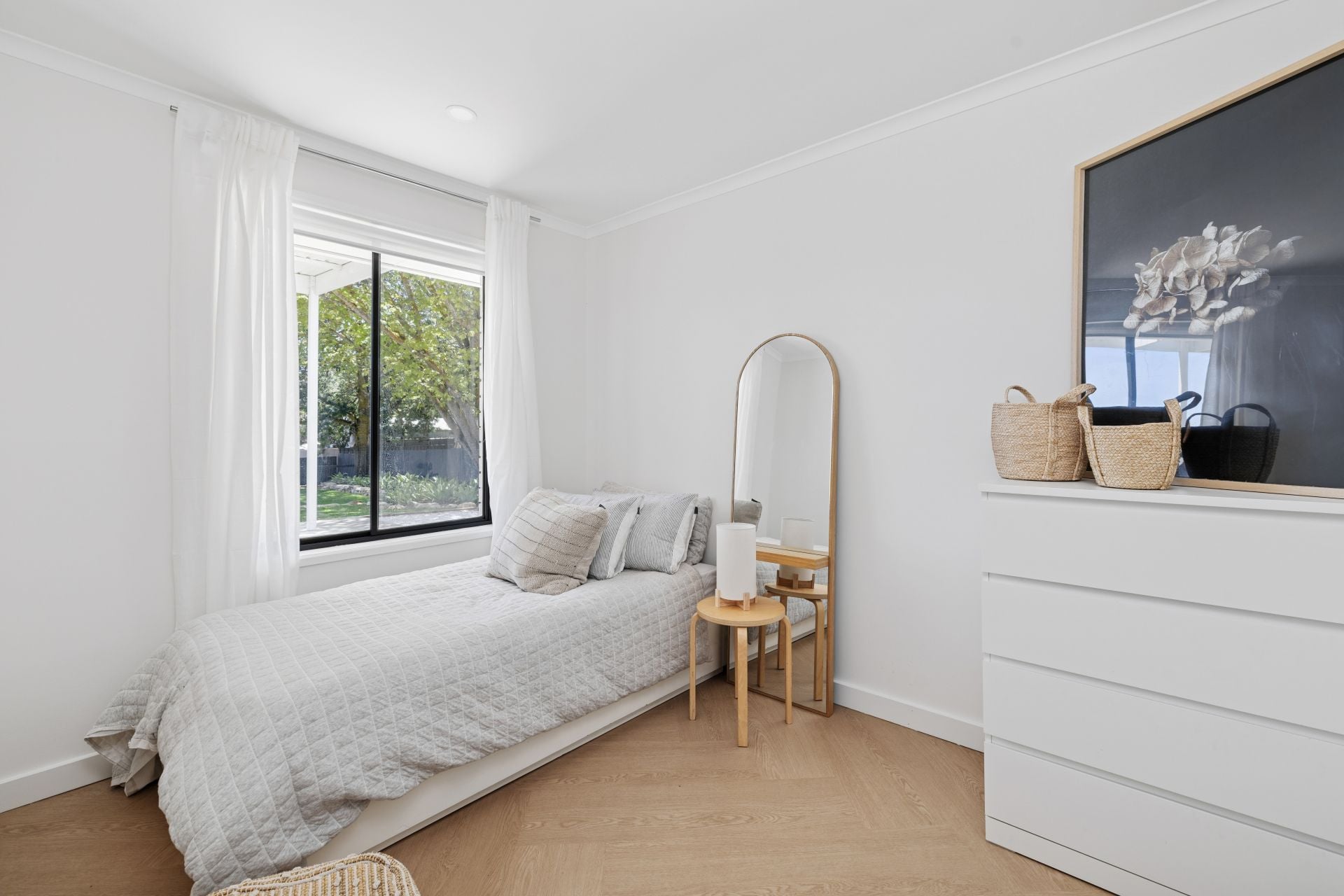 Each bedroom delights in its own quiet way. The smallest spanning generations as a nursery or a home office; the master drifting away to legroom, trending robes with half-moon handles, and an inset TV nook.