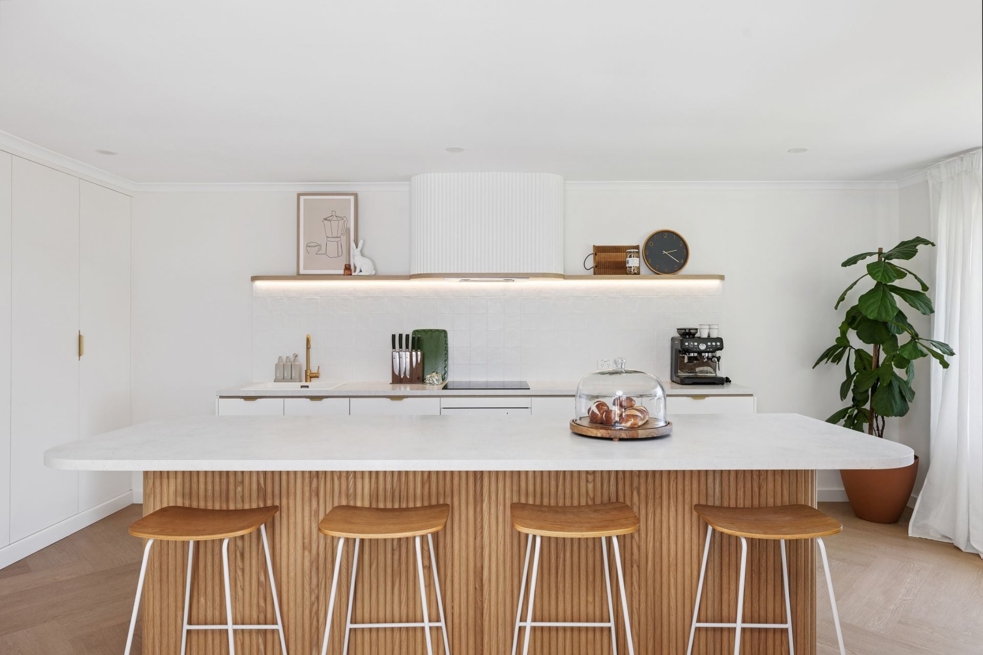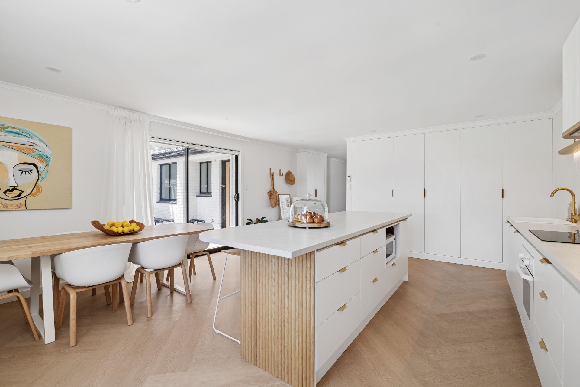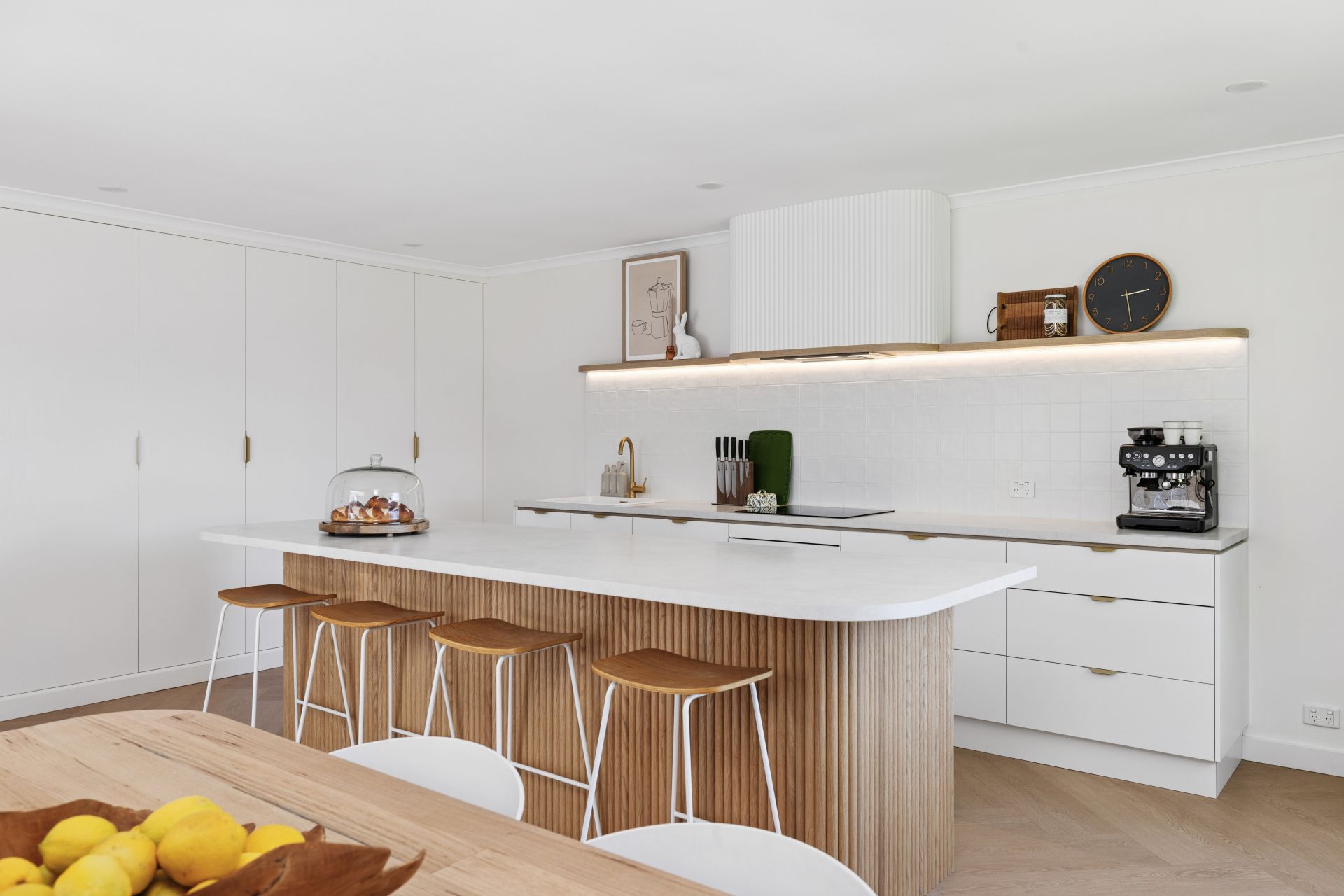 Slipping past mudroom-style custom joinery, the casual meals area meets the smart, sculptural kitchen, playing up its curves and fluted finishes with epic storage, an integrated fridge/freezer, dishwasher, and induction cooking, framed by square splashback tiles.