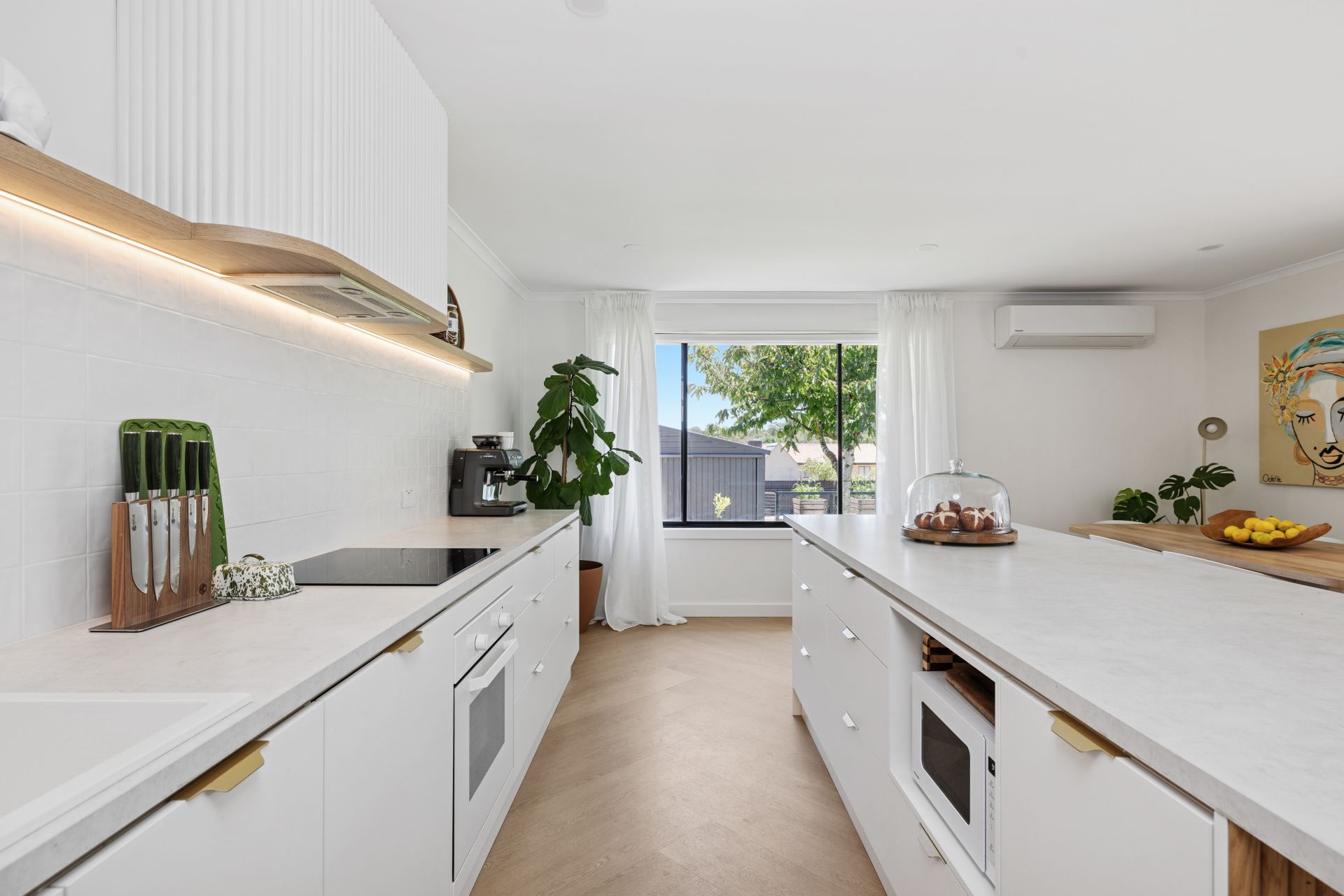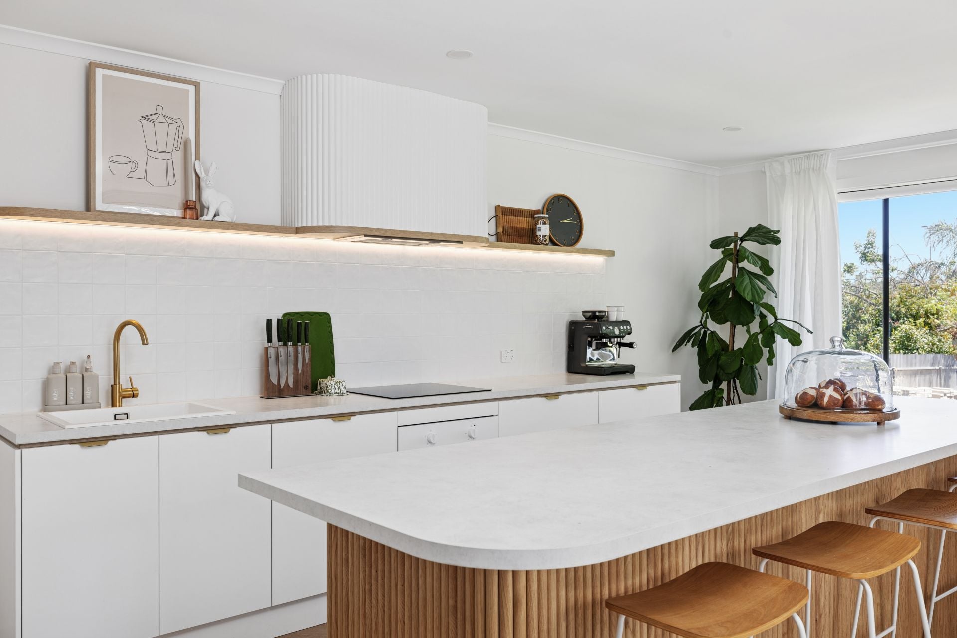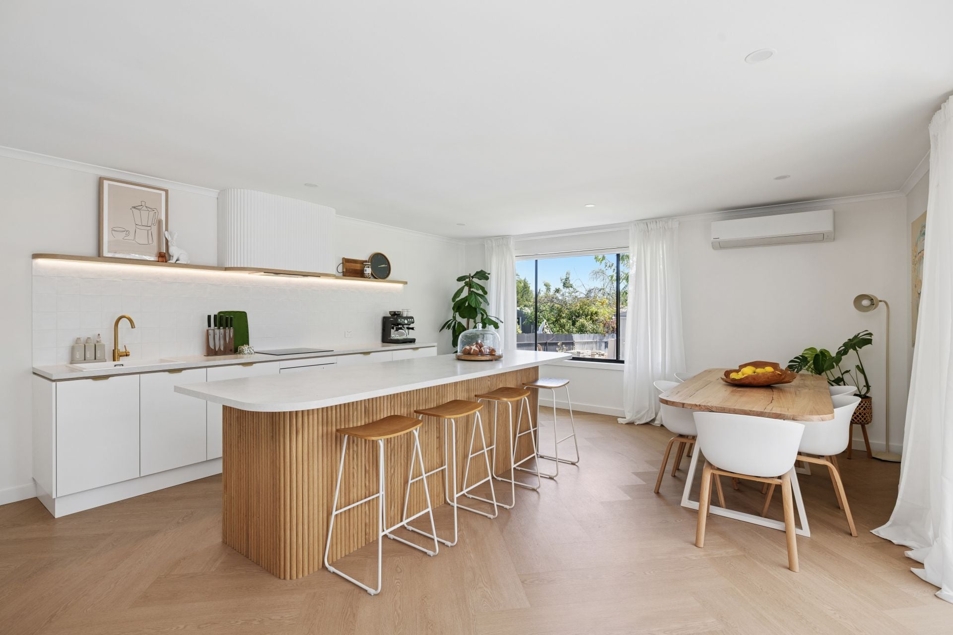 Slipping past mudroom-style custom joinery, the casual meals area meets the smart, sculptural kitchen, playing up its curves and fluted finishes with epic storage, an integrated fridge/freezer, dishwasher, and induction cooking, framed by square splashback tiles.