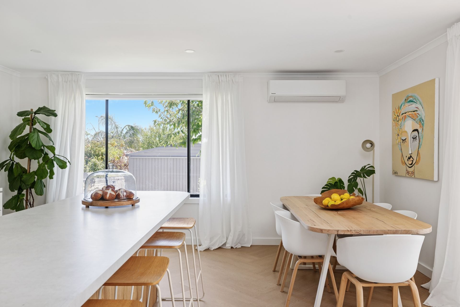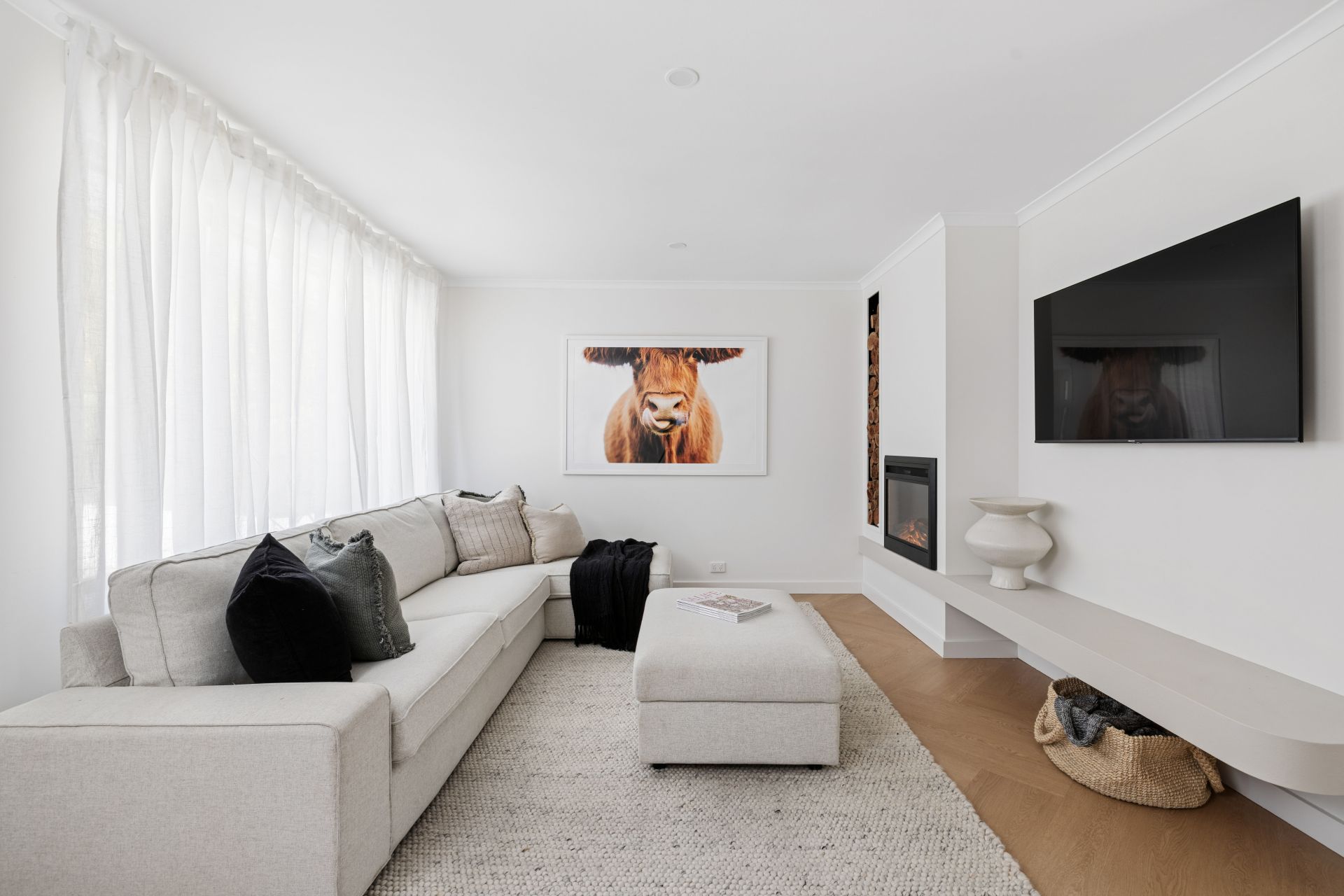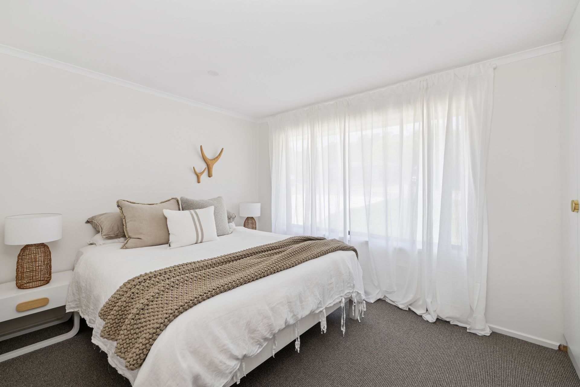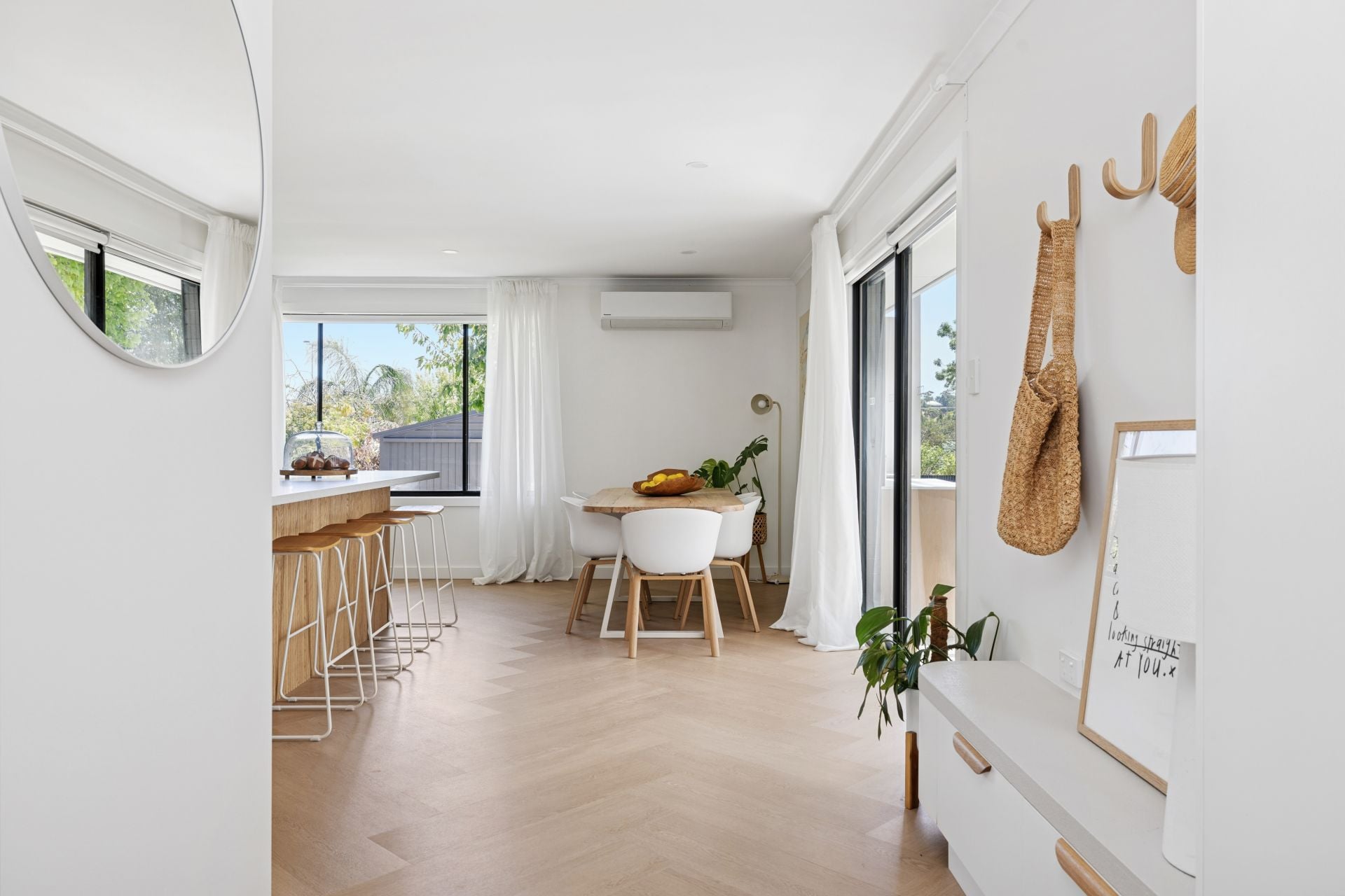 Natural filtered daylight streams through every large window, while soft sheers, soft whites and warm brass accents pull together its pared-back aesthetic.
