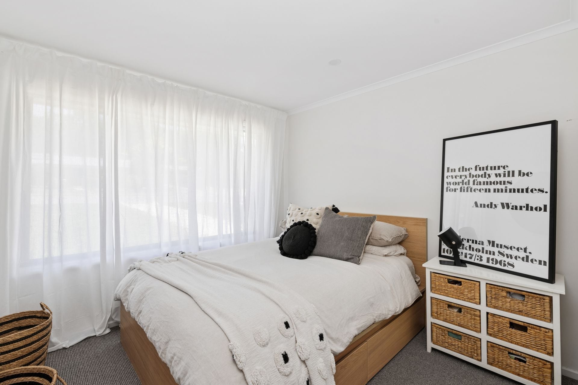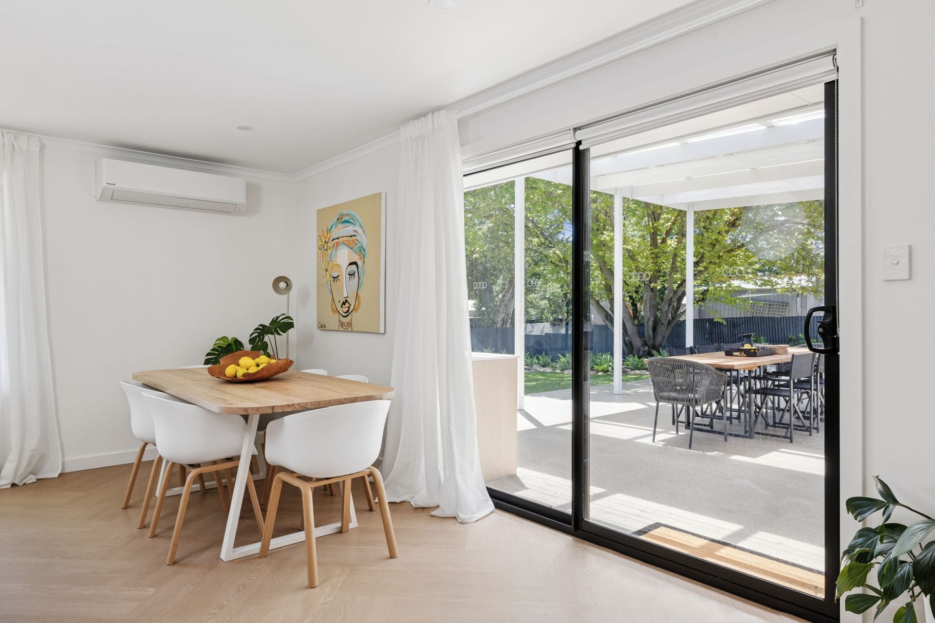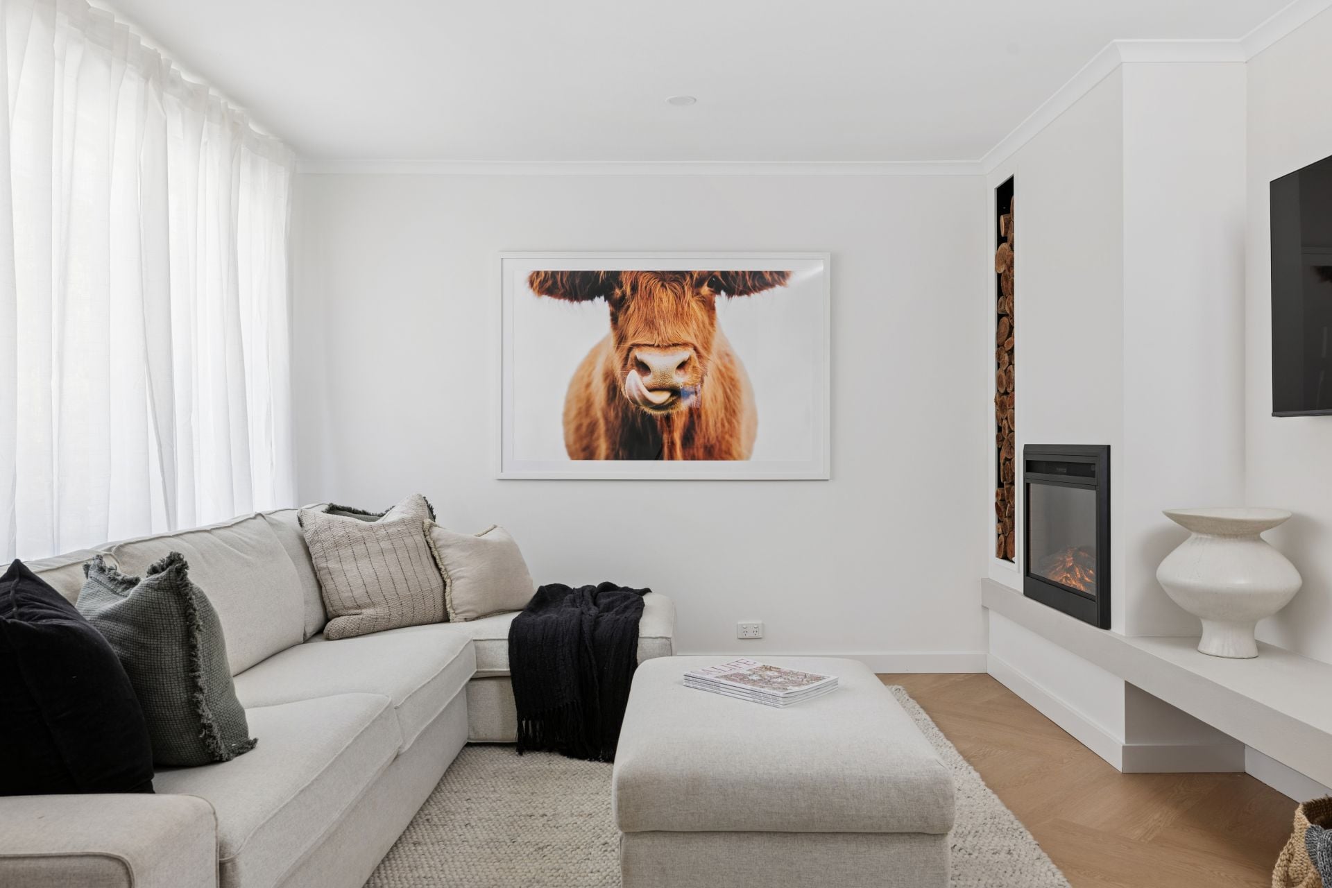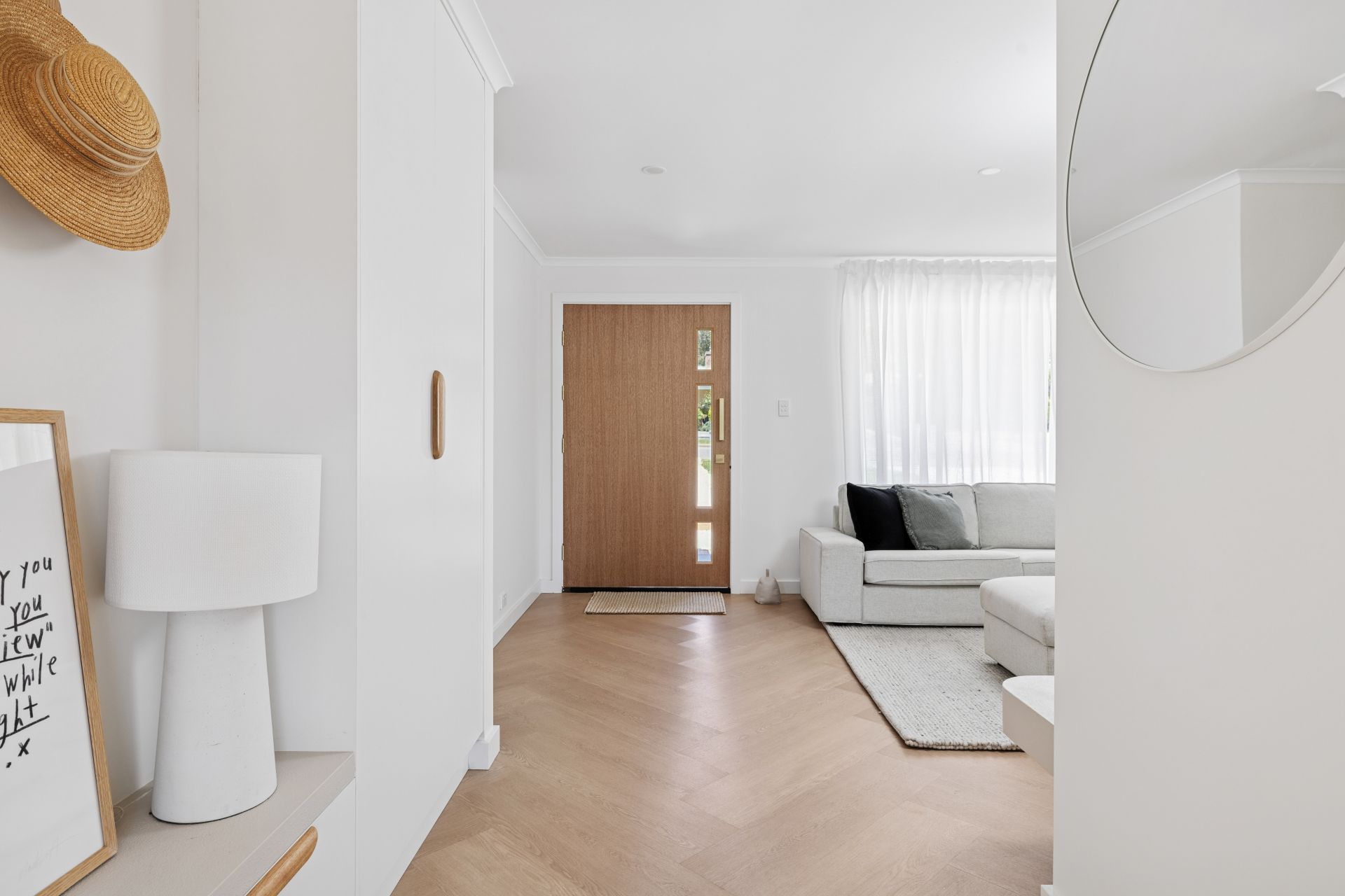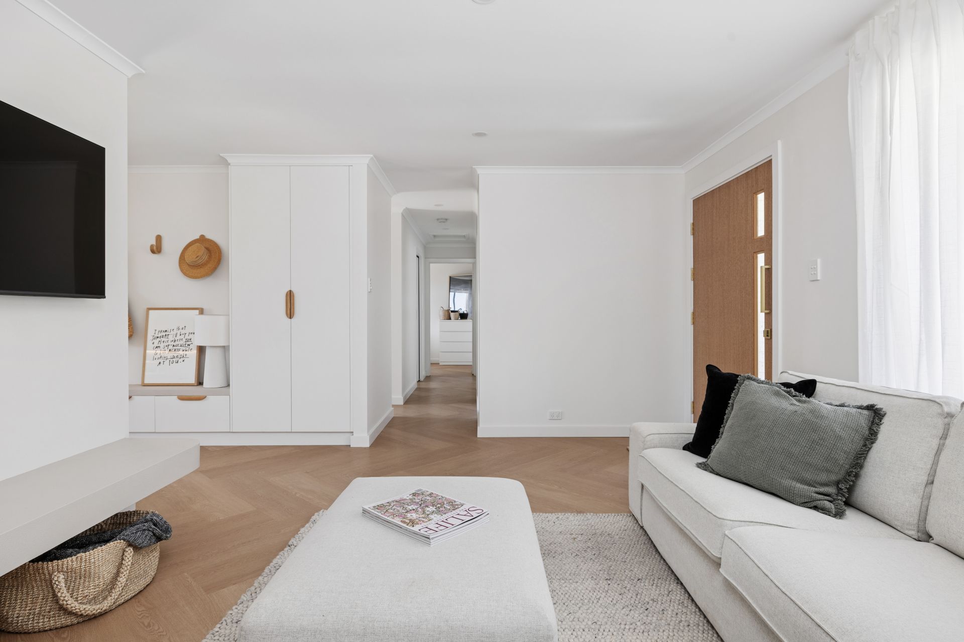 Natural filtered daylight streams through every large window, while soft sheers, soft whites and warm brass accents pull together its pared-back aesthetic.