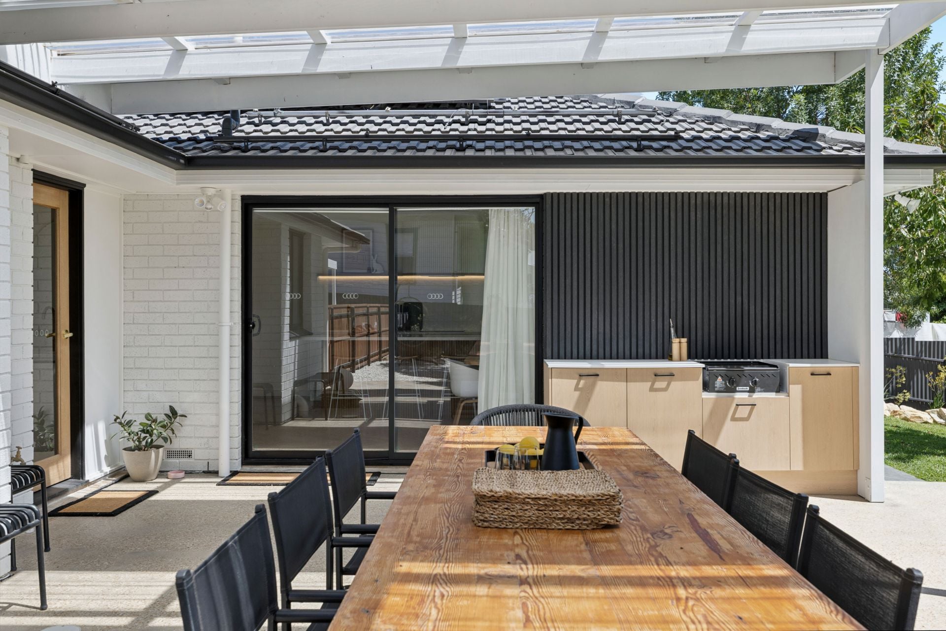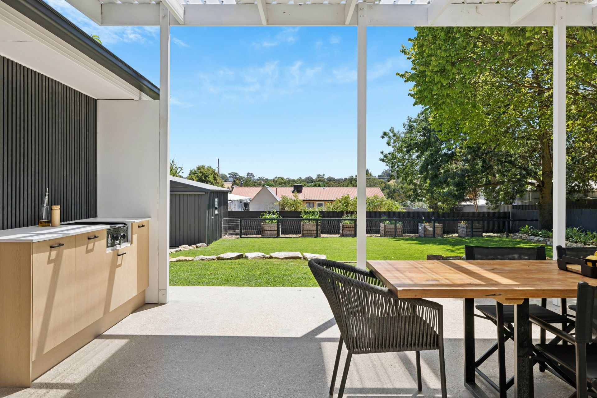 Honed aggregate concrete alfresco with a soaring roofline, inbuilt BBQ and kitchen storage
