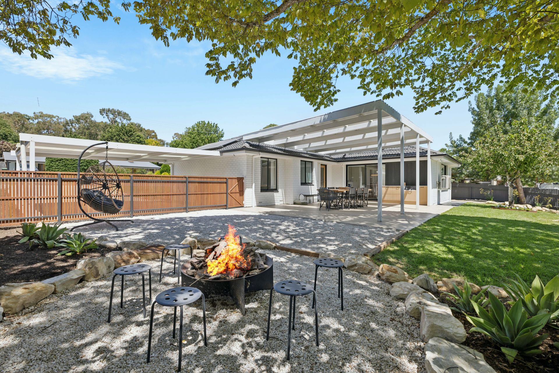 You'll gather and toast to the honed concrete alfresco and inbuilt BBQ kitchen beneath a floating-style roofline – its outlook? The fully fenced backyard, manicured lawns, shaded firepit zone, and effective water-wise plantings that create a joyous playground for everyone.