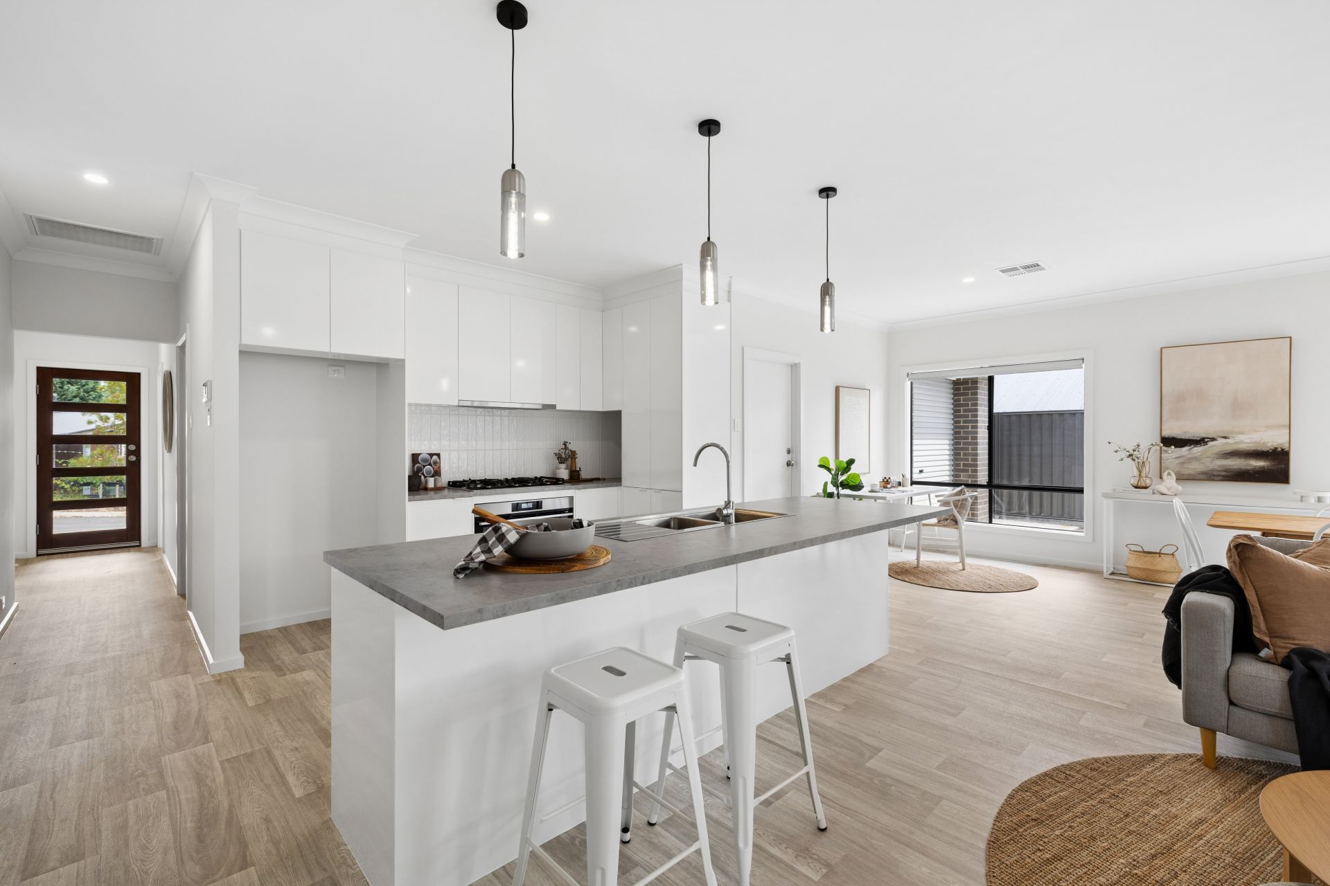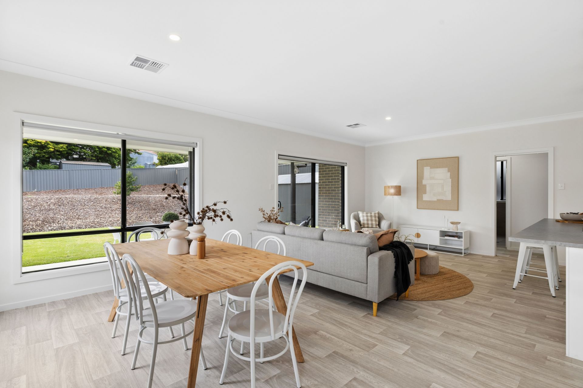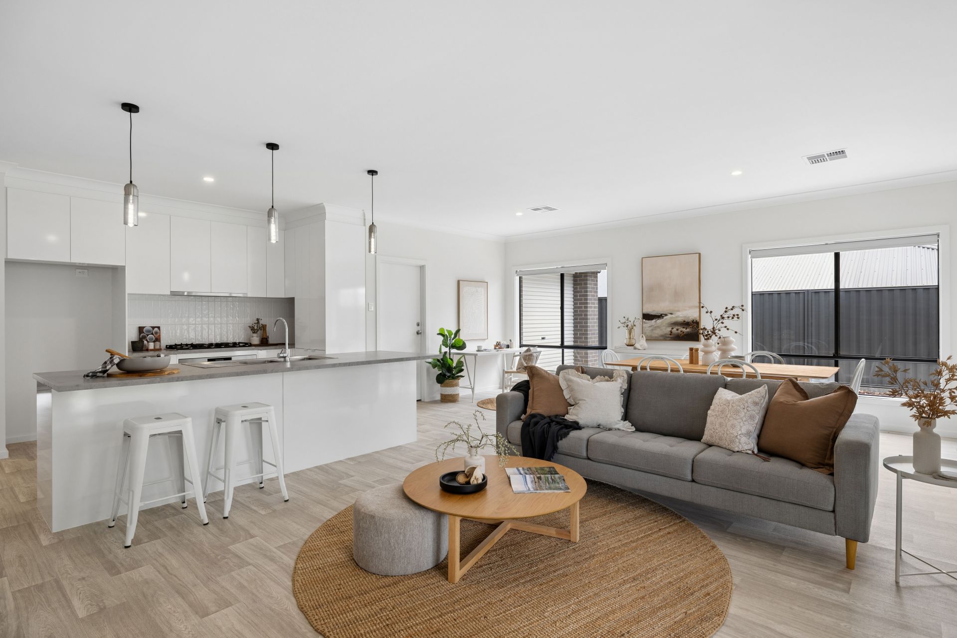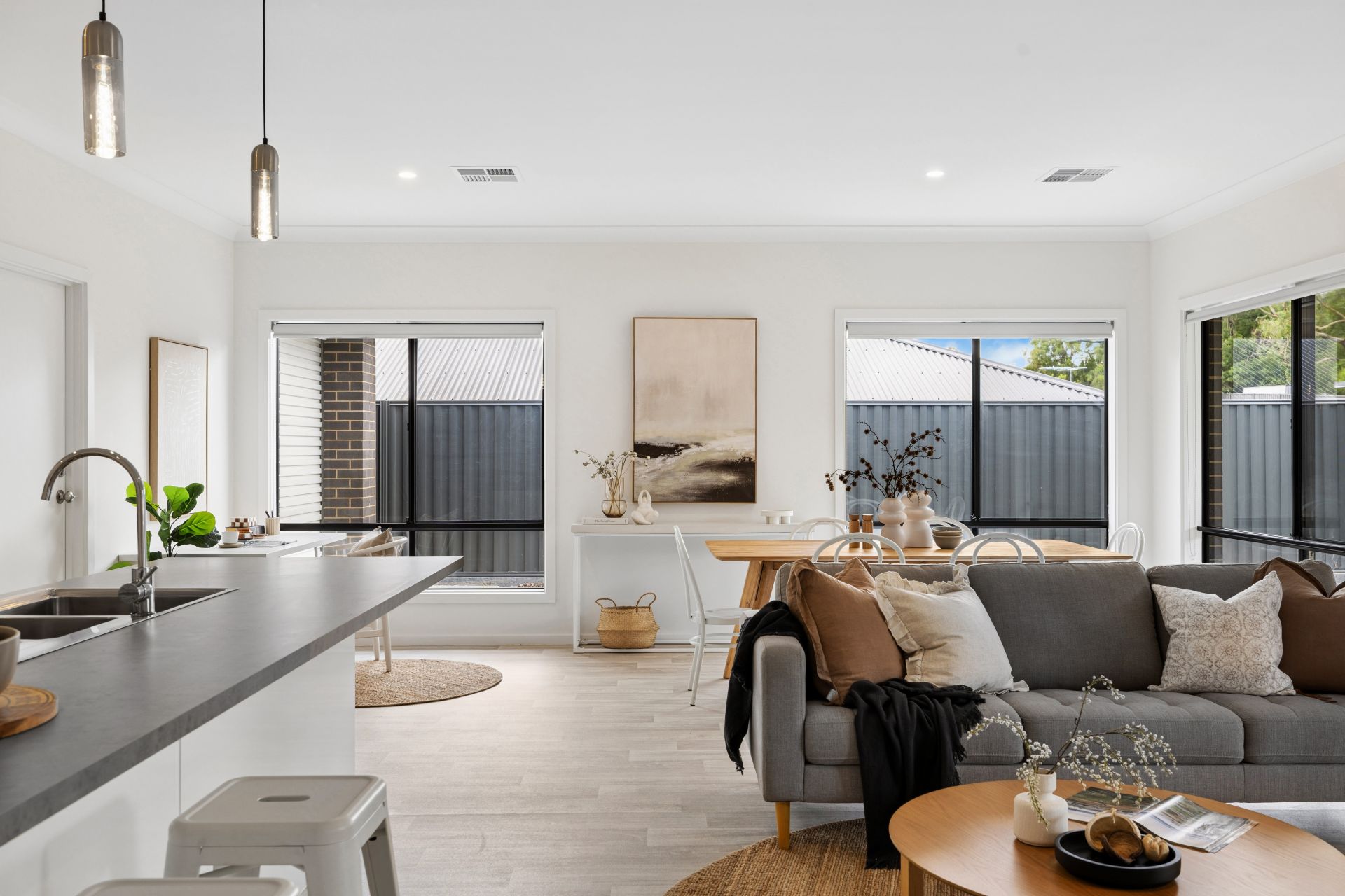 The value quickly adds up with secure dual garaging, an exposed aggregate concrete driveway, high rear fencing and retaining walls. Inside, it's timber-look flooring, downlighting, ducted reverse-cycle air conditioning, and a sunbathed gift of country life, swathed in cohesive contemporary hues.