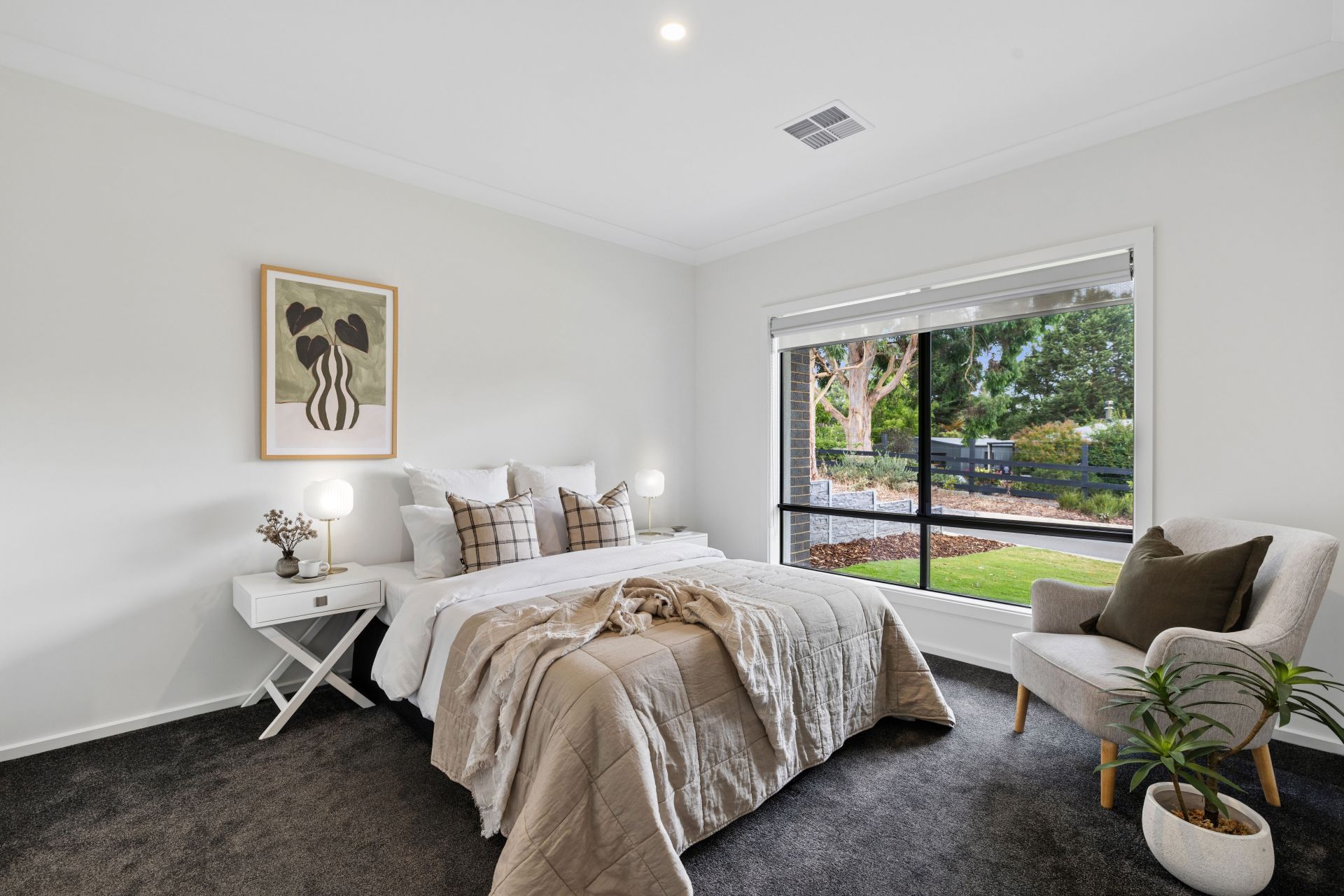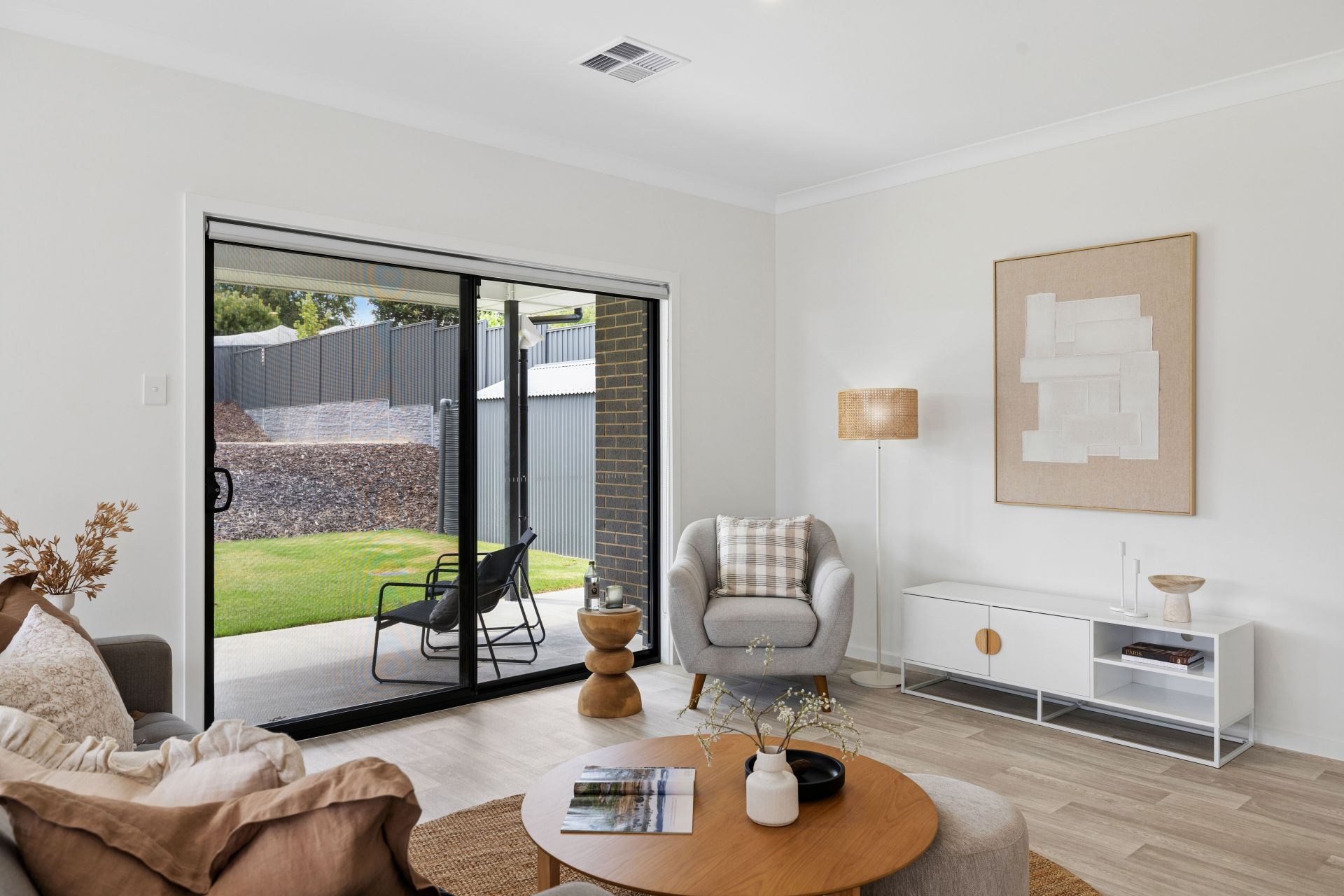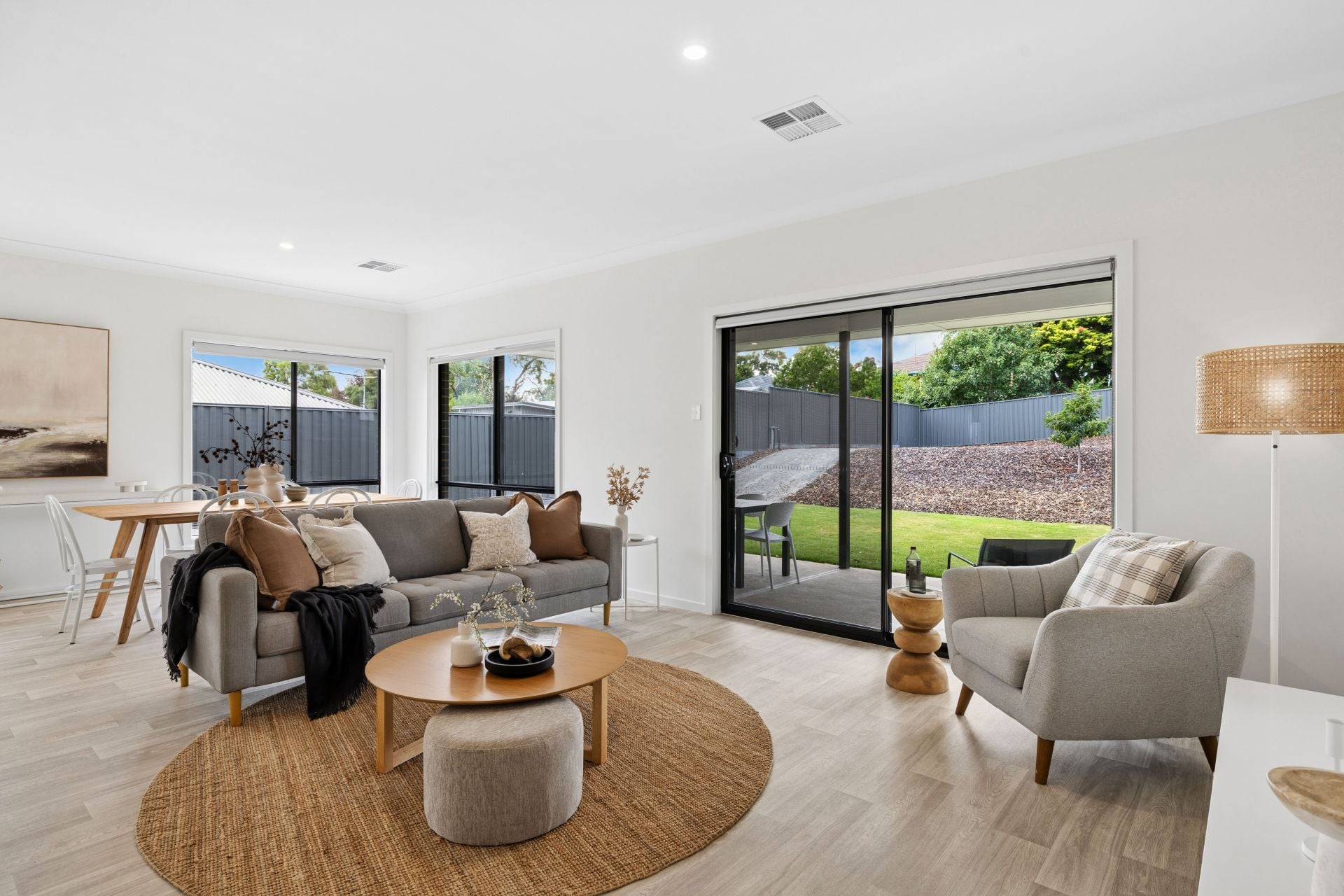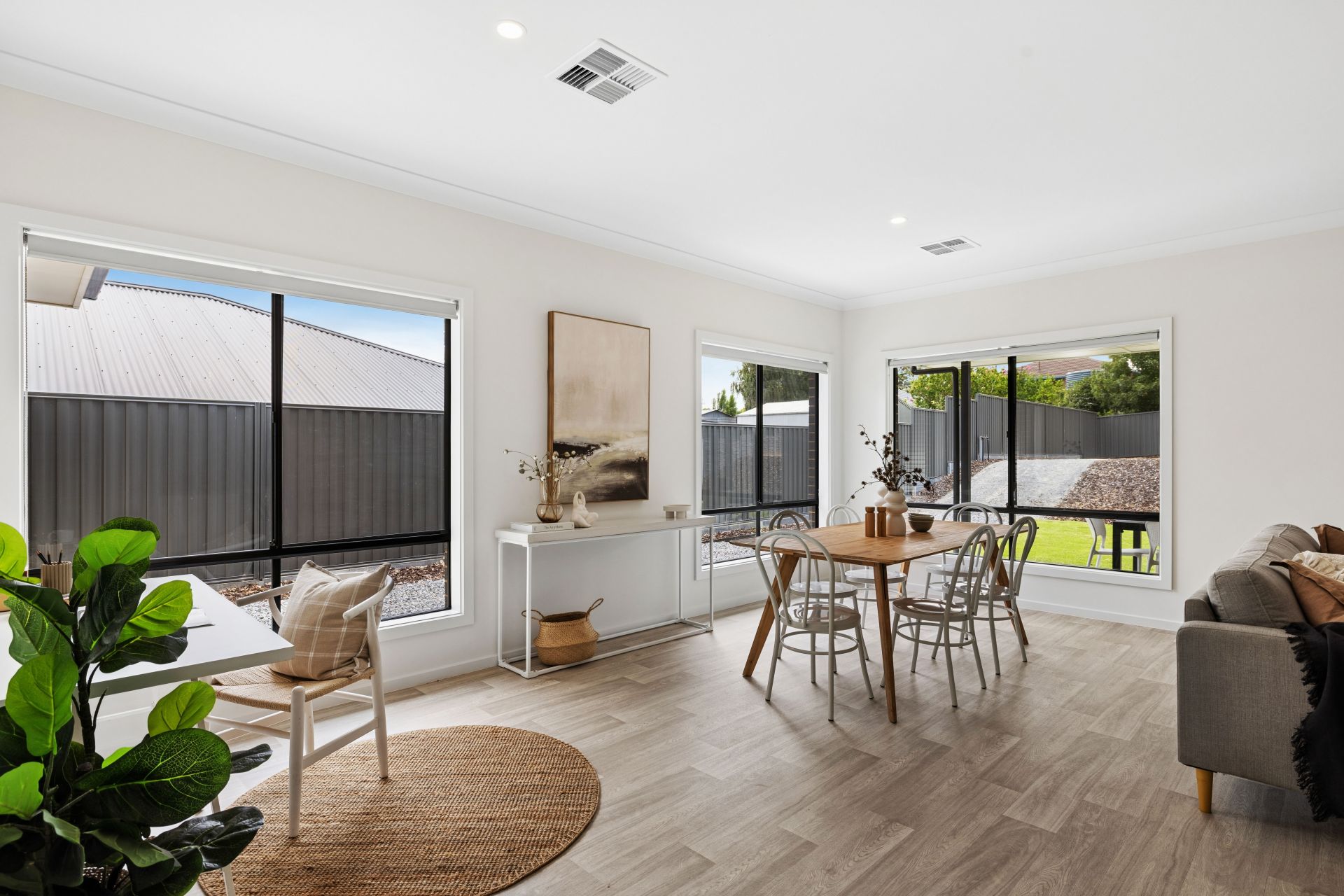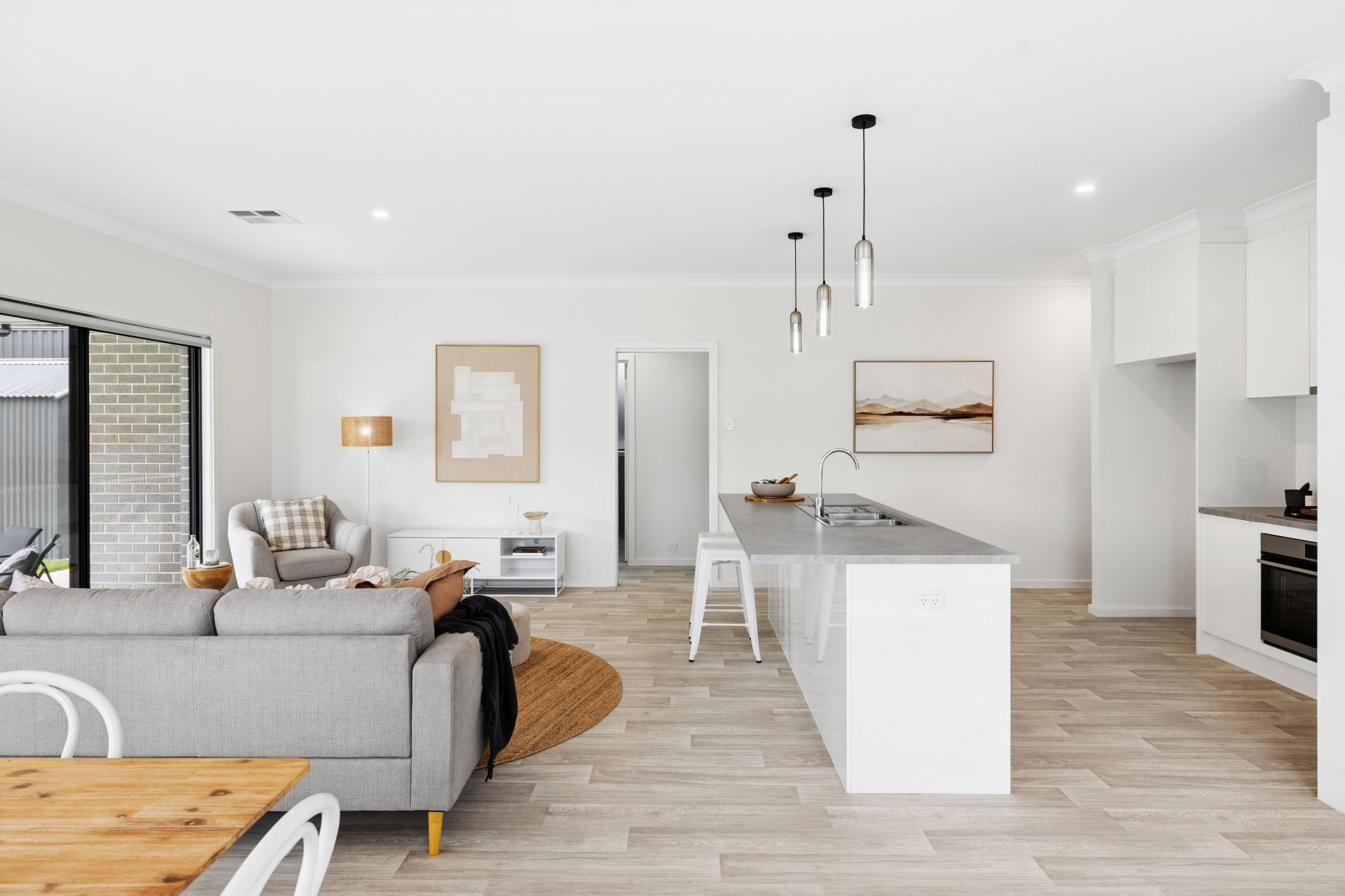 The value quickly adds up with secure dual garaging, an exposed aggregate concrete driveway, high rear fencing and retaining walls. Inside, it's timber-look flooring, downlighting, ducted reverse-cycle air conditioning, and a sunbathed gift of country life, swathed in cohesive contemporary hues.