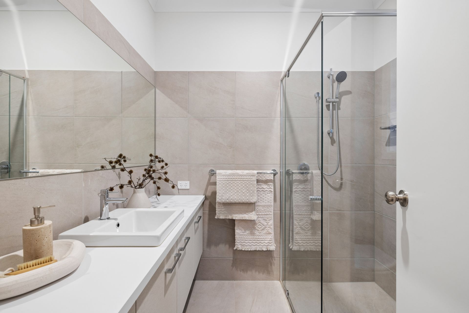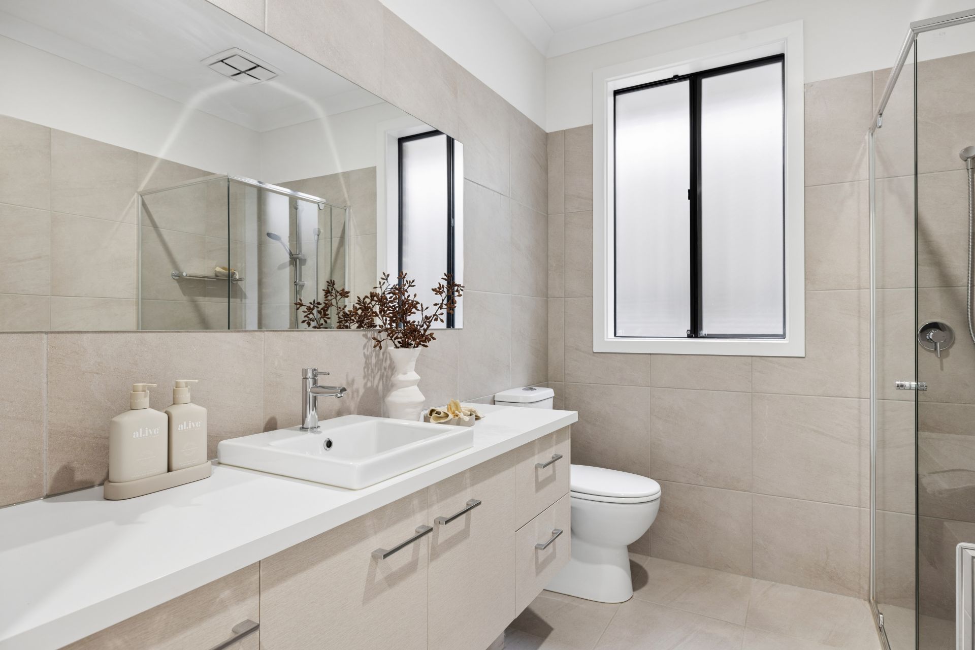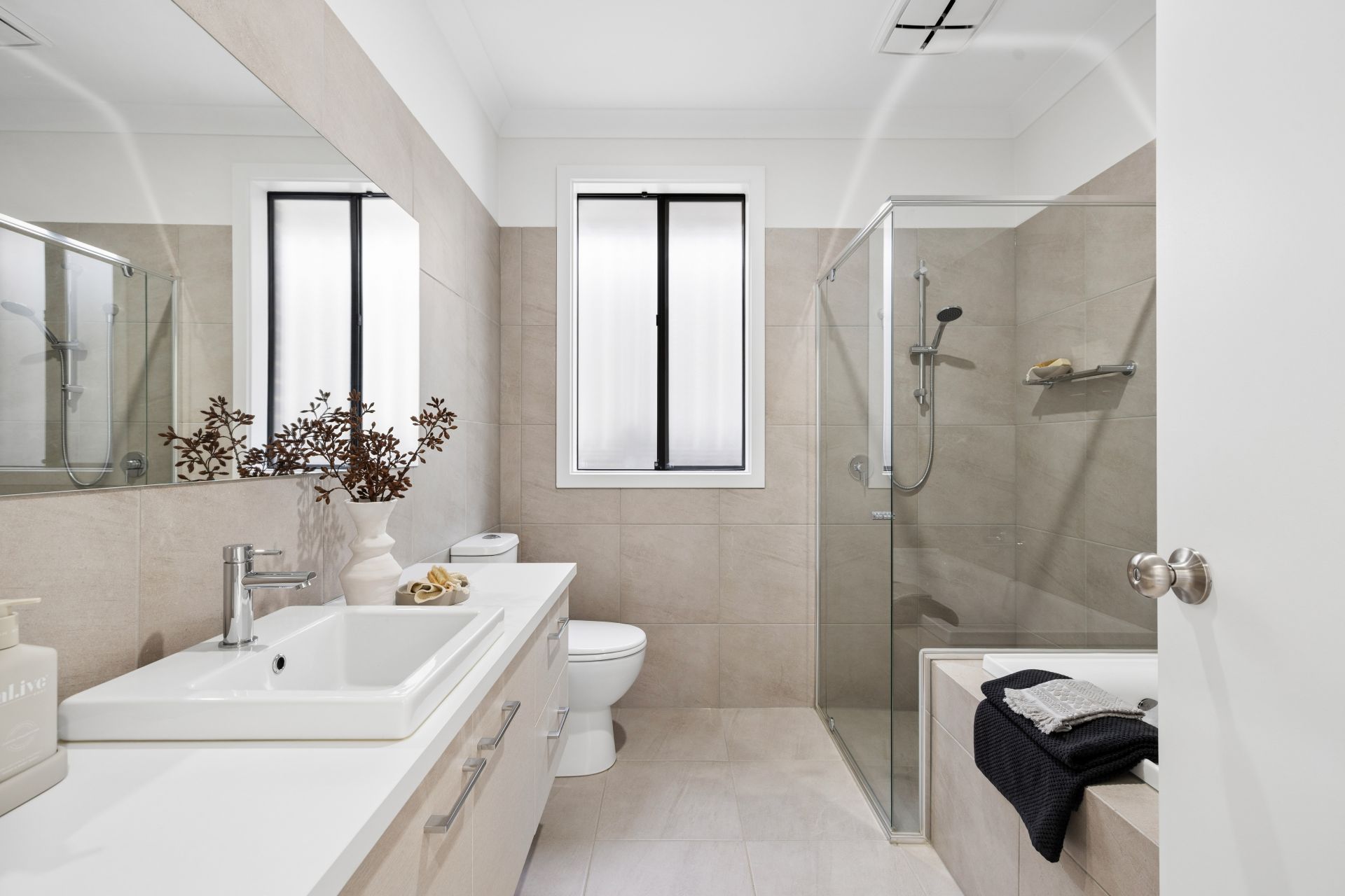 Upon entry, the primary suite issues plenty of legroom ahead of a walk-in robe, and a quality ensuite; echoing the ensuite in style and quality, the main bathroom is merely upsized - with a bathtub for the kids.