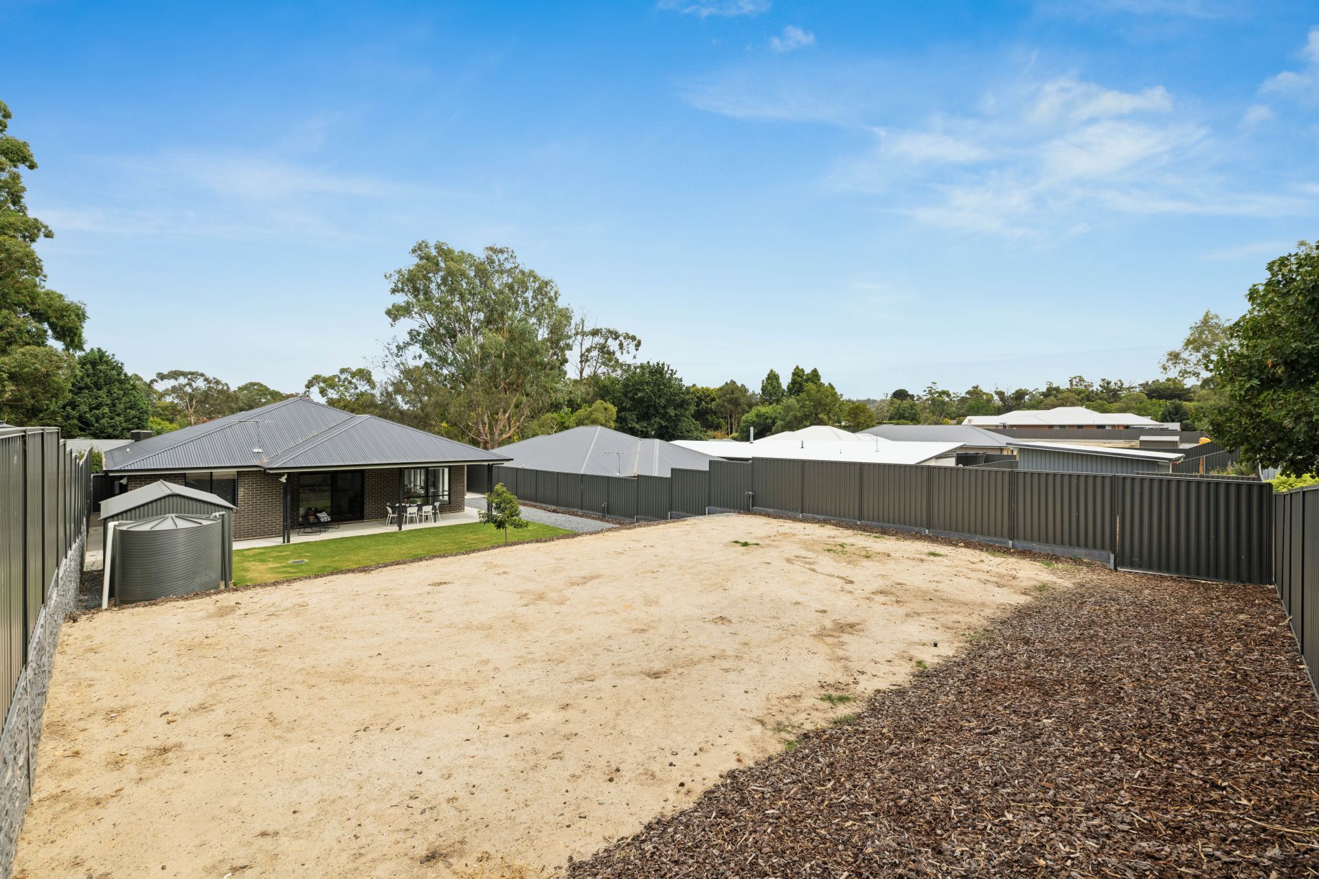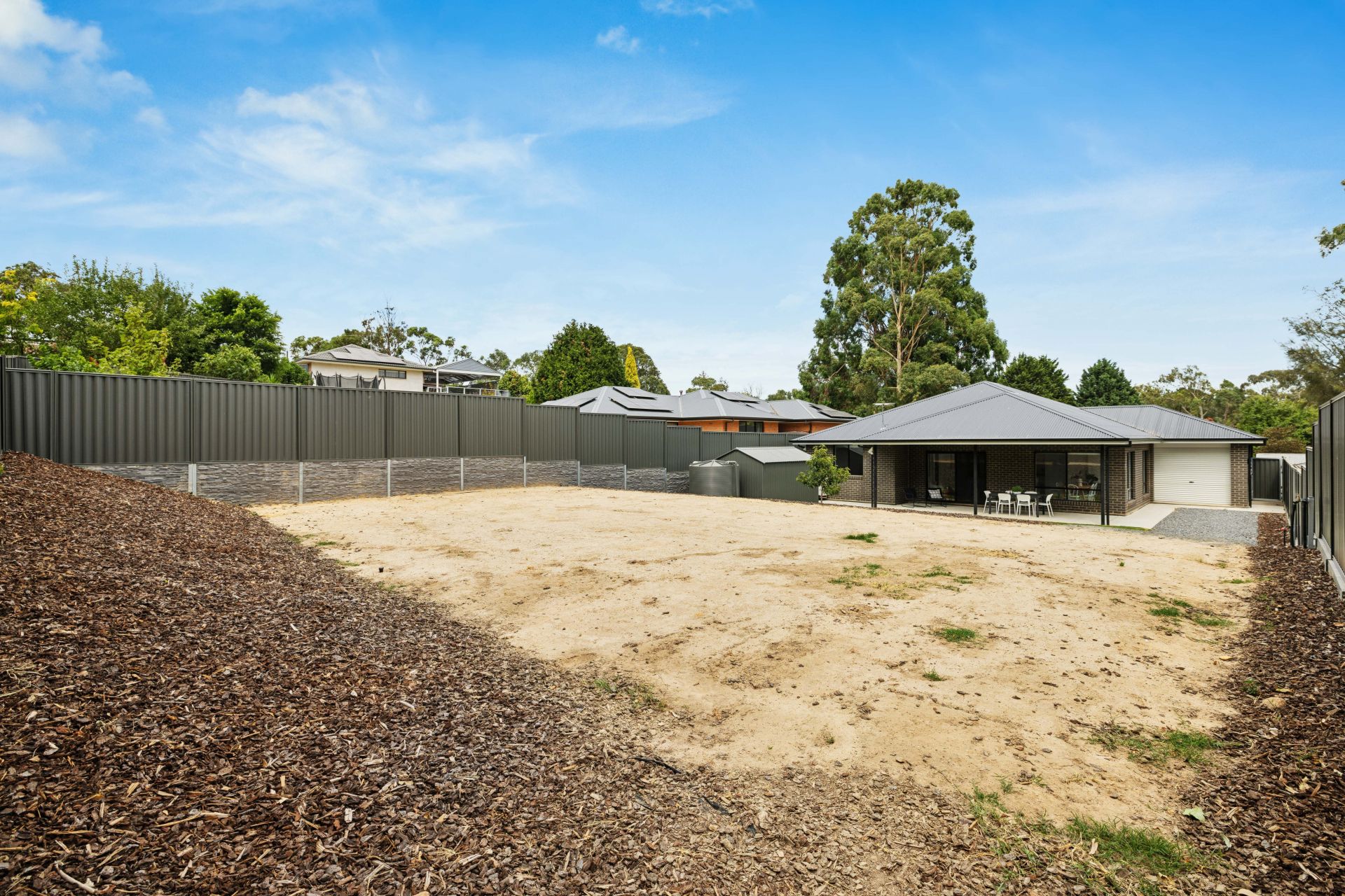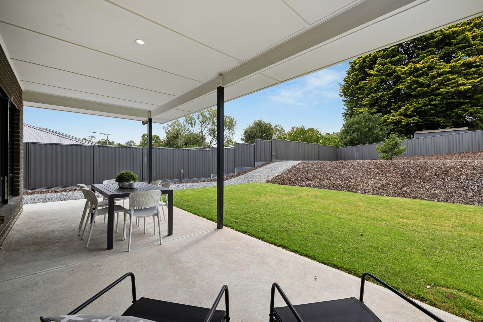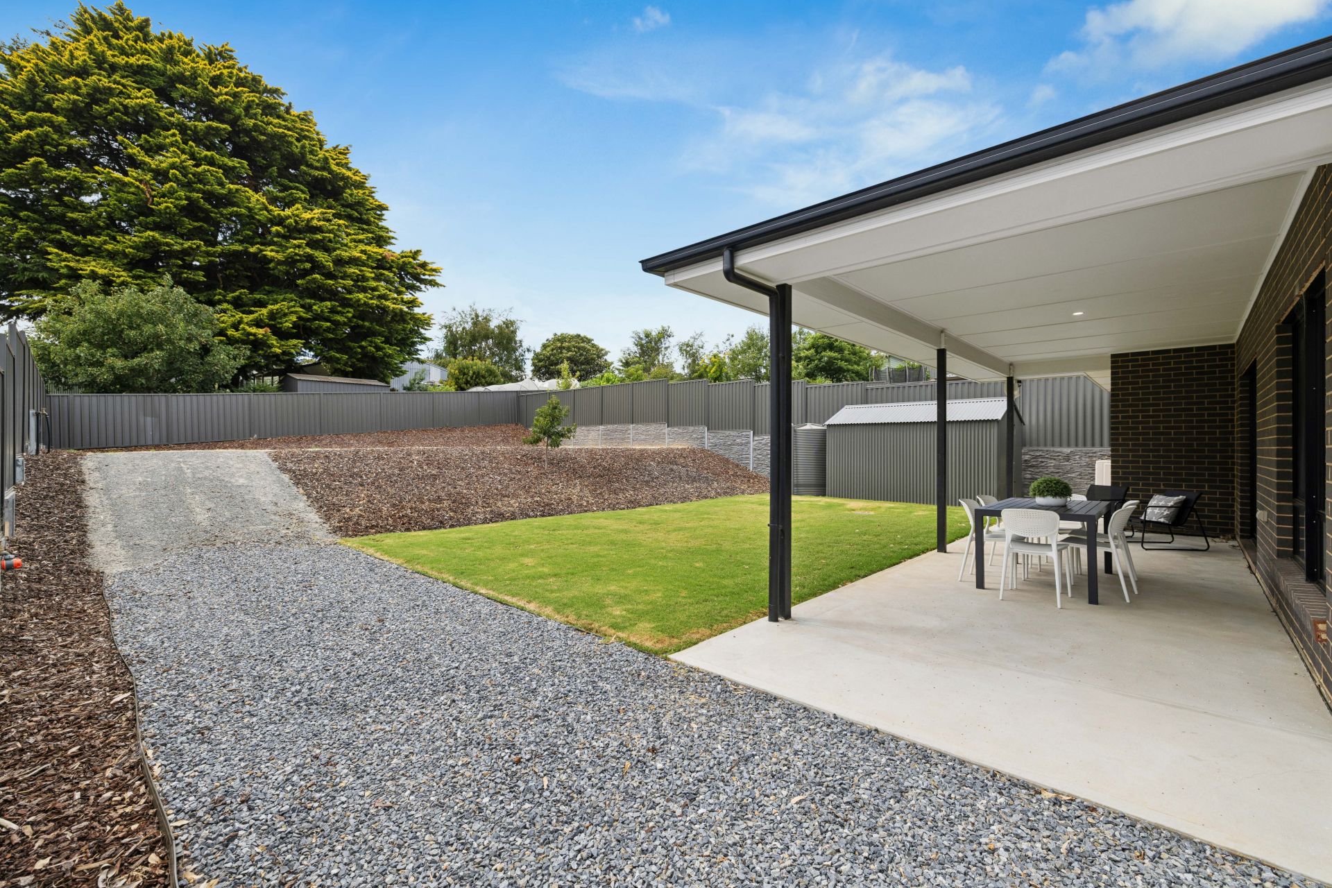With the groundwork done outdoors, all that's left is the fun part. The concrete-paved all-weather patio scans the fully fenced backyard, rising to the rear and revealing a level and inspiring template for open-air entertaining, a sports court, pool or a whopping big shed – STCC.