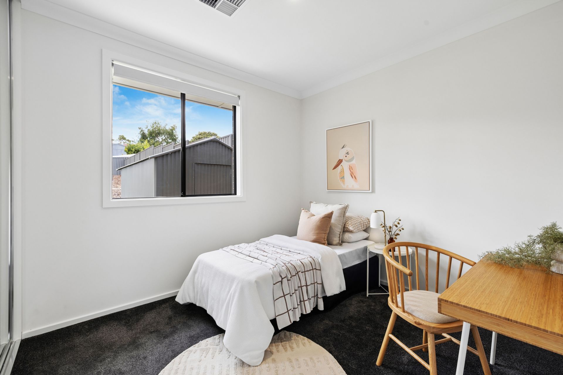 Accompanying the expansive open plan living zone is a study nook, while a cavity sliding door divides the living end from the rear-two-bedroom wing. Both equal-sized and carpeted double bedrooms enjoy backyard views and mirrored robes; the robed 4th bedroom up front leaves your options open.
