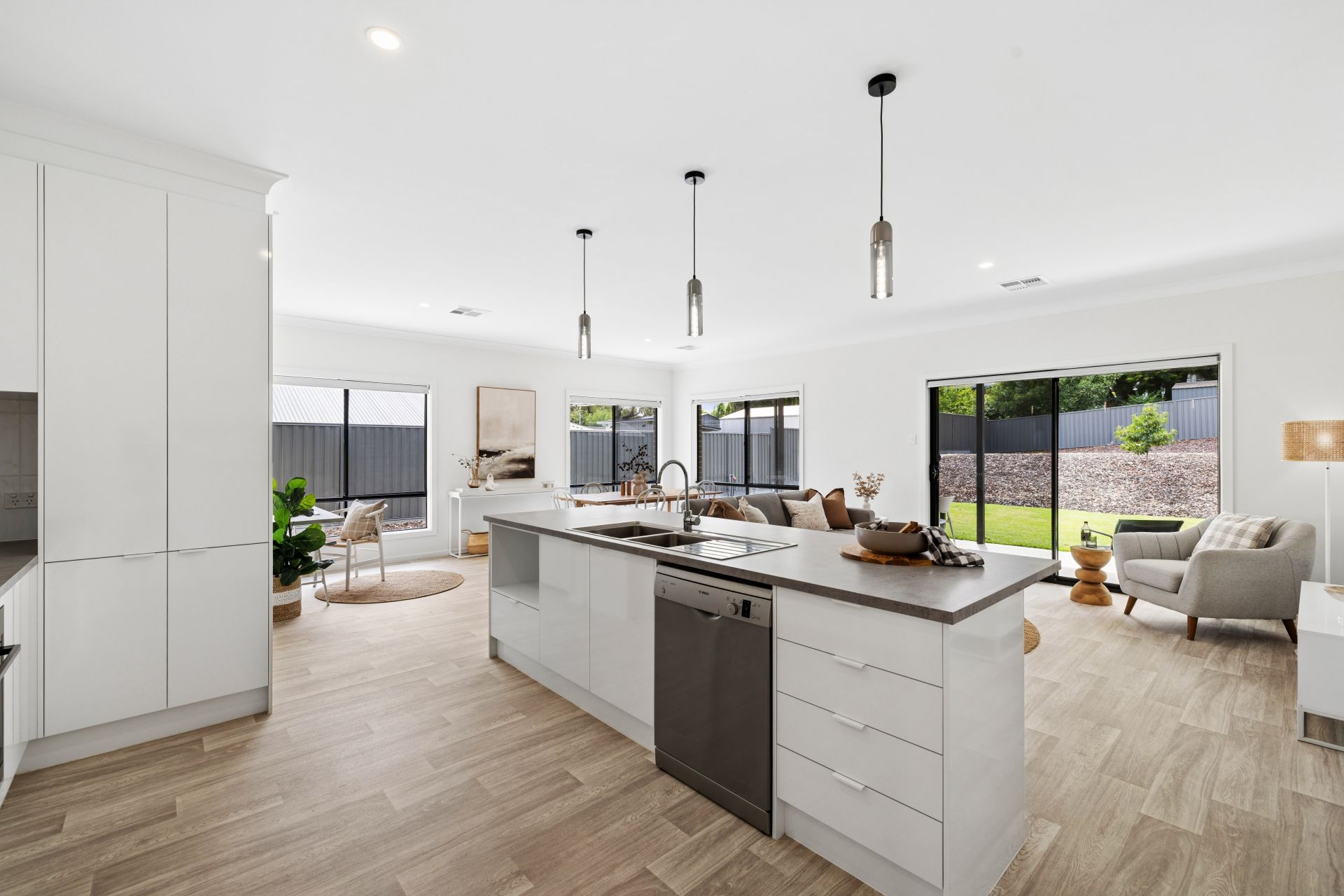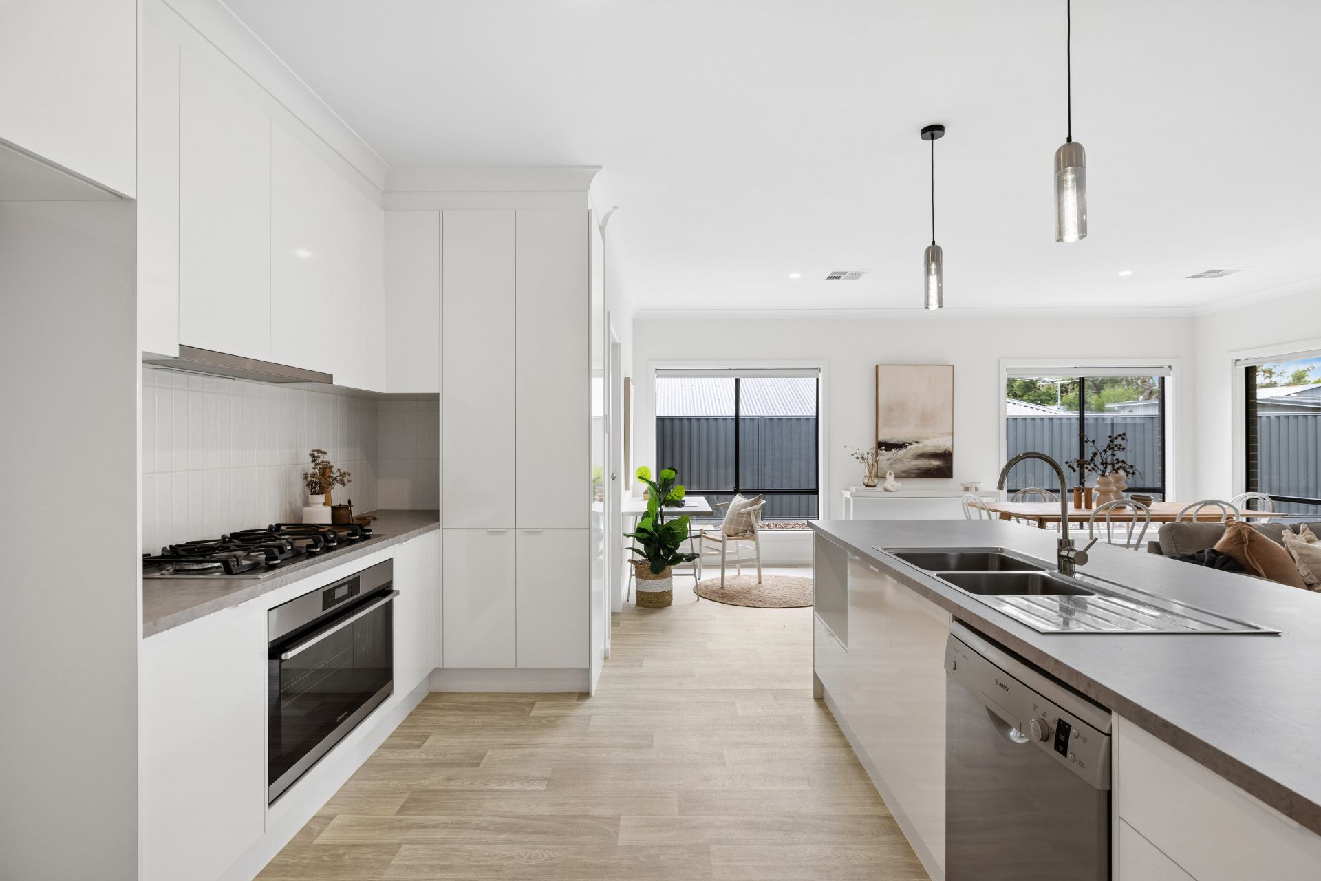 Together, it's a home that's part showpiece, and every inch the family performer. The kitchen gleams as it headlines the living end with a 900mm Westinghouse oven, gas cooktop, Bosch dishwasher within its prep island, and touchable subway splashback tiles.