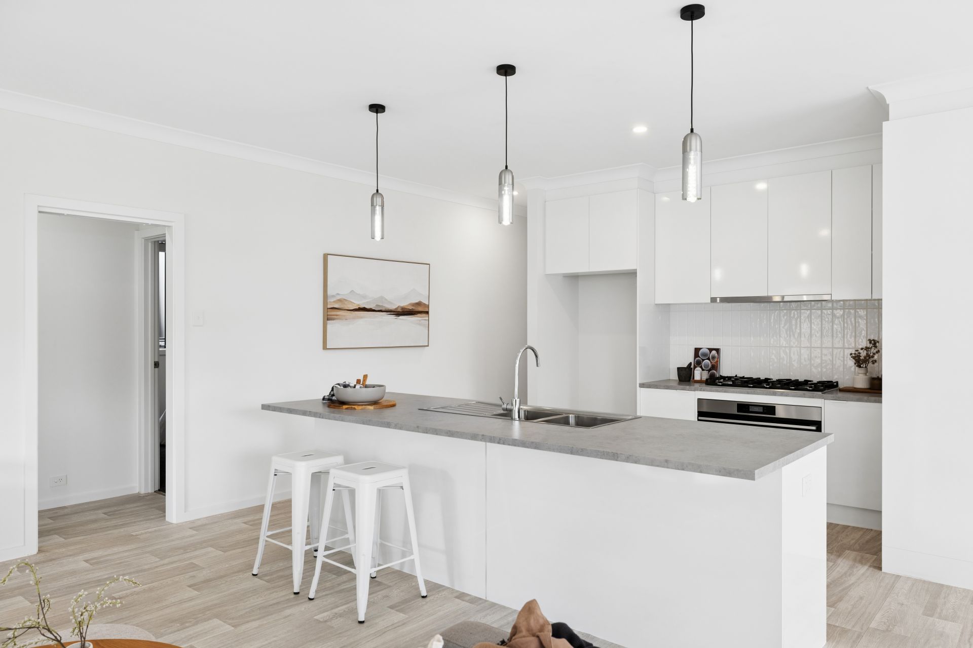 Contemporary kitchen with 900mm Westinghouse oven, gas cooktop and Bosch dishwasher